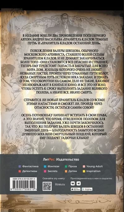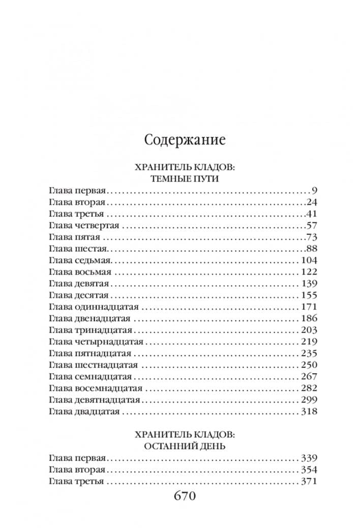 В издание вошли два произведения популярного автора Андрея Васильева «Хранитель кладов: Тёмные пути» и «Хранитель кладов: Останний день». Похождения Валеры Швецова, обычного московского архивиста, ставшего волей судьбы Хранителем кладов, и не думают заканчиваться. Более того — они становятся все опаснее и страшнее. Теперь ему предстоит попасть в закрытый для всего мира дом, жильцы которого очень не любят незваных гостей, пройти через Туманные Пути болот, куда смертным путь испокон века заказан, и узнать о том, что оборотни на самом деле не такие, какими их изображают в книгах и кино. И все это нужно, чтобы успеть к сроку выполнить задание Великого Полоза. А иначе все. Иначе смерть. Справится ли новый Хранитель Кладов со всеми этими напастями и сможет ли, пройдя через опасности, остаться самим собой? Осень потихоньку начинает вступать в свои права, а это значит, что время, отведенное Полозом для выполнения задания, уже почти закончилось. Так что же получит Валера Швецов в останний змеиный день — благодарность забытого всеми древнего бога или смертельный поцелуй, который ему подарят гадючьи клыки?