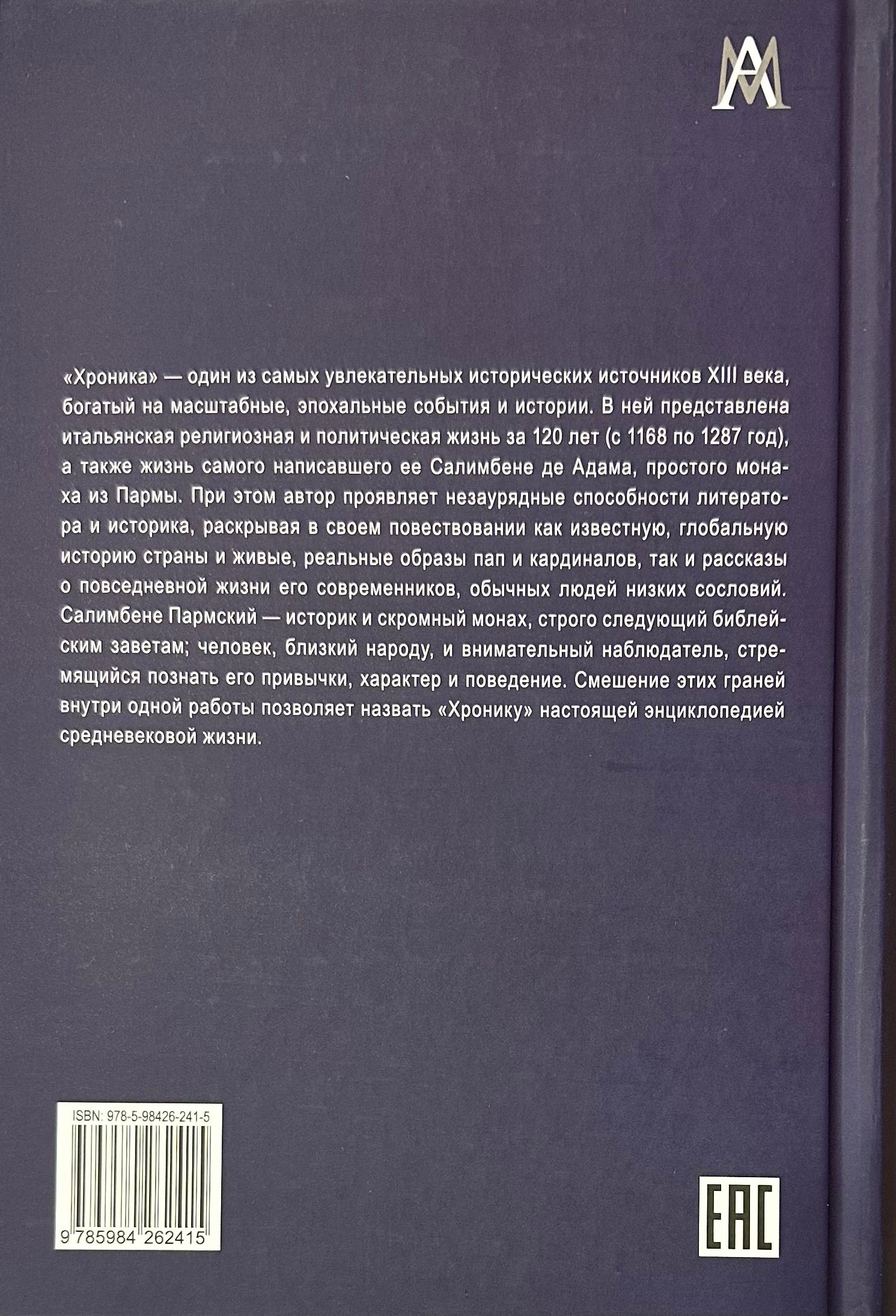«Хроника» — один из самых увлекательных исторических источников XIII века, богатый на масштабные, эпохальные события и истории. В ней представлена итальянская религиозная и политическая жизнь за 120 лет (с 1168 по 1287 год), а также жизнь самого написавшего ее Салимбене де Адама, простого монаха из Пармы. При этом автор проявляет незаурядные способности литератора и историка, раскрывая в своем повествовании как известную, глобальную историю страны и живые, реальные образы пап и кардиналов, так и рассказы о повседневной жизни его современников, обычных людей низких сословий. Салимбене Пармский — историк и скромный монах, строго следующий библейским заветам; человек, близкий народу, и внимательный наблюдатель, стремящийся познать его привычки, характер и поведение. Смешение этих граней внутри одной работы позволяет назвать «Хронику» настоящей энциклопедией средневековой жизни.
