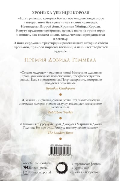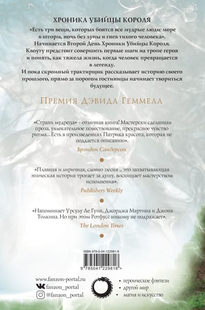 Долгожданное продолжение культового романа «Имя ветра»! Юный Квоут делает первые шаги на тропе героя: он убережет влиятельного лорда от предательства, победит группу опасных бандитов, уйдет живым от искусной соблазнительницы Фелуриан. Но на каждом головокружительном повороте своей необыкновенной судьбы он не забудет о своем истинном стремлении – найти и уничтожить мифических чандриан, жестоко убивших его семью и оставивших его круглой сиротой… А еще он узнает, какой трудной может быть жизнь, когда человек становится легендой своего времени. И пока скромный трактирщик рассказывает историю своего прошлого, прямо за порогом гостиницы начинает твориться будущее.