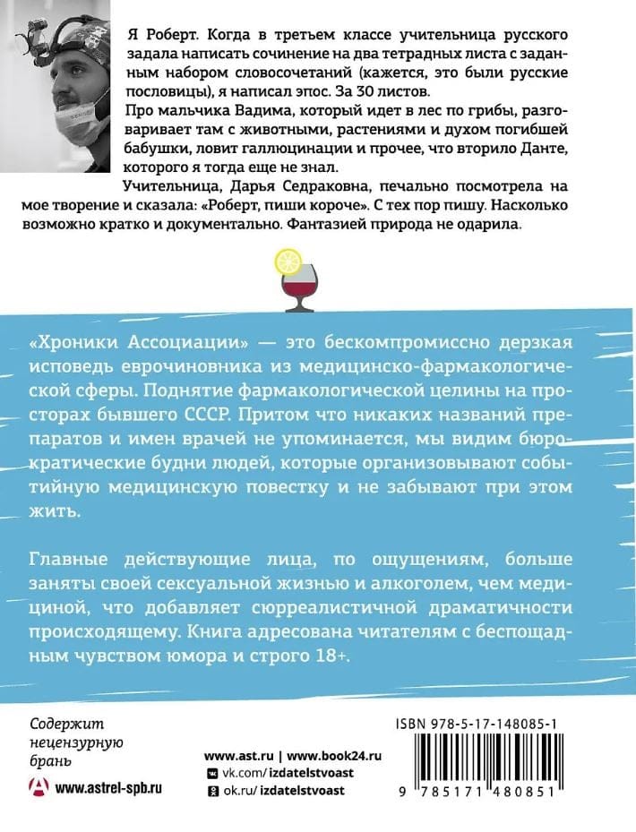 «Хроники Ассоциации» — это бескомпромиссно дерзкая исповедь еврочиновника из медицинскофармакологической сферы. Поднятие фармакологической целины на просторах бывшего СССР. Притом что никаких названий препаратов и имен врачей не упоминается, мы видим бюрократические будни людей, которые организовывают событийную медицинскую повестку и не забывают при этом жить.