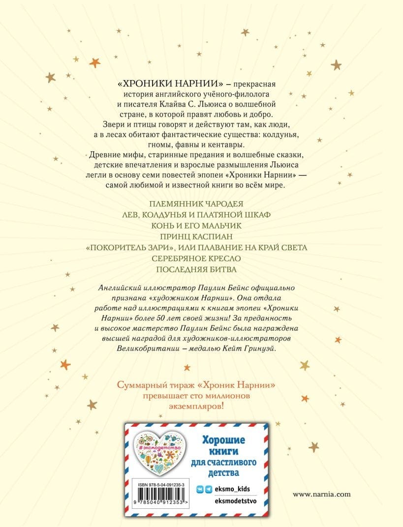 Древние мифы, старинные предания и волшебные сказки, детские впечатления и взрослые размышления английского писателя Клайва С.Льюиса легли в основу семи повестей эпопеи "Хроники Нарнии" — самой любимой и известной книги во всем мире. Книга оформлена цветными рисунками Паулин Бейнс, которая официально признана "художником Нарнии" и отдала работе над иллюстрациями к книгам эпопеи более 50 лет своей жизни.