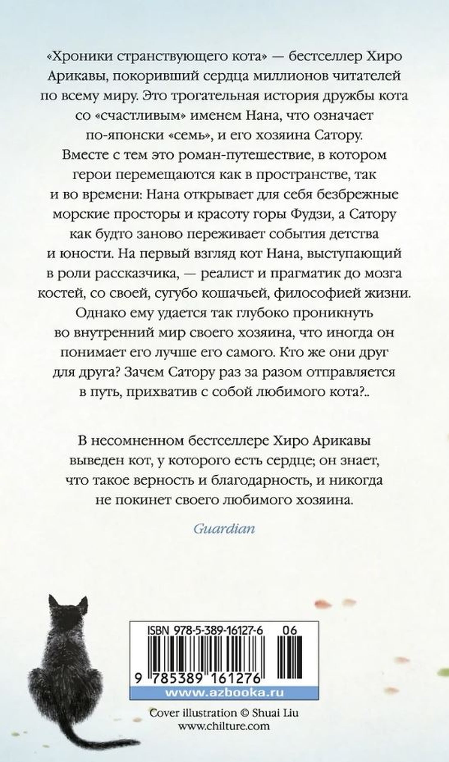 «Хроники странствующего кота» – бестселлер Хиро Арикавы, покоривший сердца миллионов читателей по всему миру. Это трогательная история дружбы кота со «счастливым» именем Нана, что означает по-японски «семь», и его хозяина Сатору. Вместе с тем это роман-путешествие, в котором герои перемещаются как в пространстве, так и во времени: Нана открывает для себя безбрежные морские просторы и красоту горы Фудзи, а Сатору как будто заново переживает события детства и юности. На первый взгляд, кот Нана, выступающий в роли рассказчика, - реалист и прагматик до мозга костей, со своей, сугубо кошачьей, философией жизни. Однако ему удается так глубоко проникнуть во внутренний мир своего хозяина, что иногда он понимает его лучше него самого. Кто же они друг для друга? Зачем Сатору раз за разом отправляется в путь, прихватив с собой любимого кота? Впервые на русском!