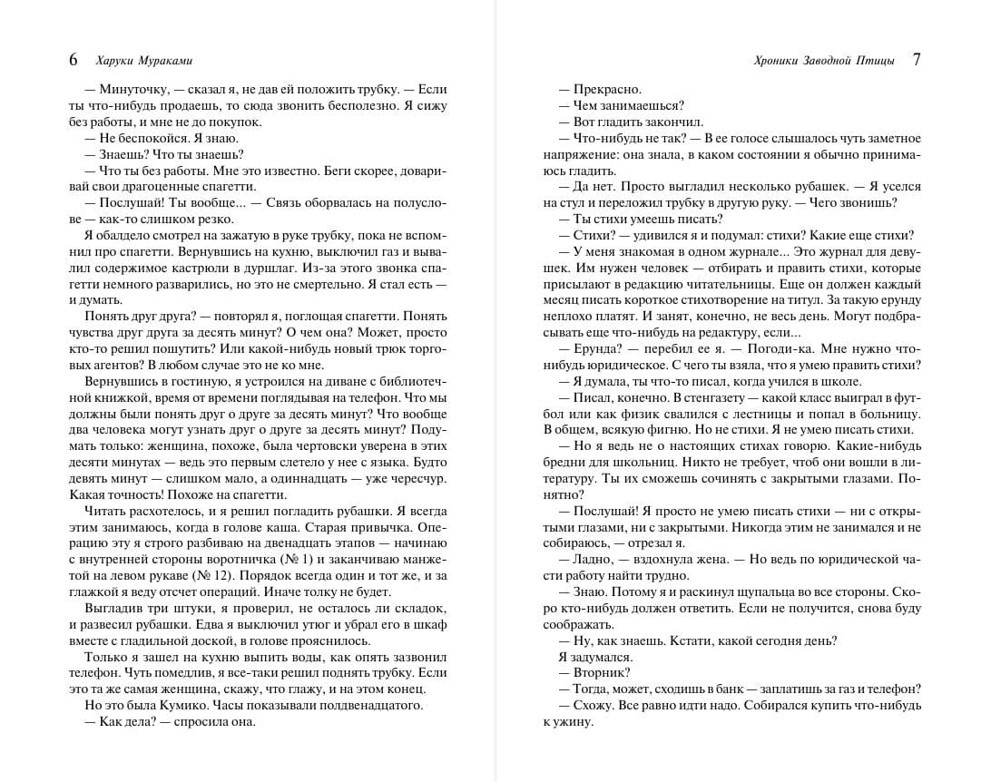 «Хроники Заводной Птицы» — масштабное произведение: в нем письма, мистические сны, воспоминания, журнальные статьи, закодированные файлы — цельное полотно, сотканное из невероятных событий, тонкой иронии и неподражаемой интонации Харуки Мураками.
