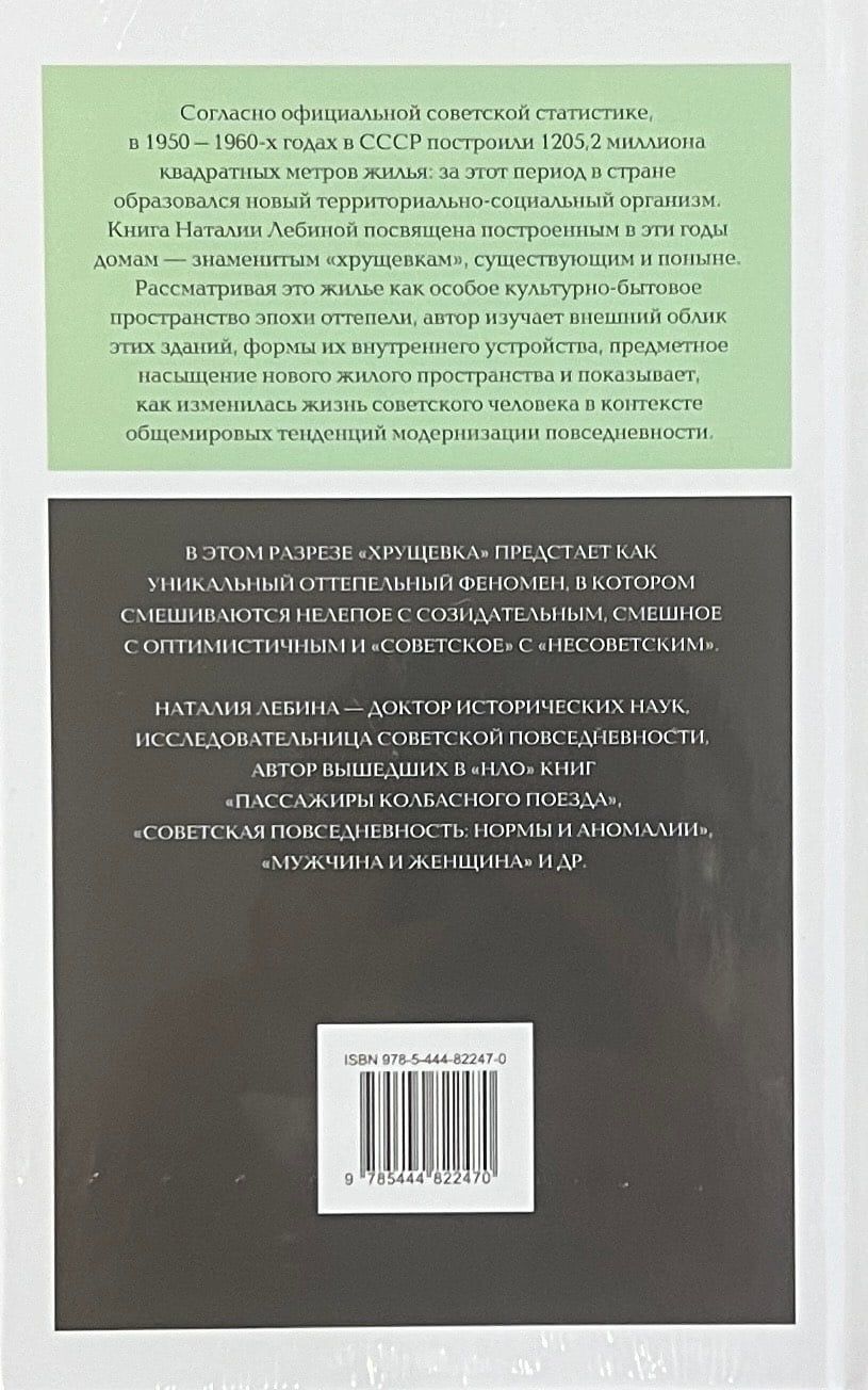 Согласно официальной советской статистике, в 1950–1960 х годах в СССР построили 1205,2 миллиона квадратных метров жилья: за этот период в стране образовался новый территориально-социальный организм. Книга Н. Лебиной посвящена построенным в эти годы домам — знаменитым «хрущевкам», существующим и поныне.