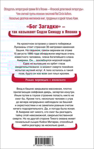 Продолжение культовой интеллектуальной загадки «Токийский зодиак». Уникальная головоломка, связывающая ХХ век с древней цивилизацией. На крохотном островке у самого побережья Луизианы стоит странная 30-метровая каменная башня. На седьмом, самом верхнем ее этаже 15 августа 1986 года обнаружили мертвым очень известного человека, члена богатейшего клана Америки. Он… захлебнулся морской водой. Едва не выпавшие из орбит глаза свидетельствовали: в момент смерти покойник испытал жуткий испуг. А тело осталось в такой позе, будто он изо всех сил плыл кролем. Вход в башню закрывала массивная, плотно прилегающая сейфовая дверь, запертая изнутри. Иным путем в глухое строение попасть никто не смог бы. Кроме того, несколько человек с утра до вечера непрерывно наблюдали за башней и окрестностями и не заметили ровным счетом ничего подозрительного. Да, и погода была ясная. В Америке нет никого, кто смог бы разгадать тайну этой невозможной, сверхъестественной смерти. Но на другой стороне Тихого океана живет гениальный сыщик Киёси Митараи, способный найти разгадку за несколько дней… «Ничто никогда не озадачивало американскую полицию так, как эта смерть в августе 1986 года и необъяснимое место обнаружения трупа… А еще накануне возле башни видели странное существо с торчащими как у волка ушами, большими круглыми глазами и ртом, разрезающим щеки от уха до уха. Чудовище, видимо, поздно ночью появилось из моря». — Кадзуми Исиока «Бог Загадки» — так называют Содзи Симаду в Японии. Обладатель литературной премии № 1 в Японии — «Японской детективной литературы». Член элитной группы японских писателей Red Circle Authors. Несколько десятков миллионов книг, проданных в одной только Азии.