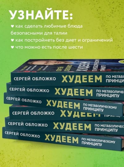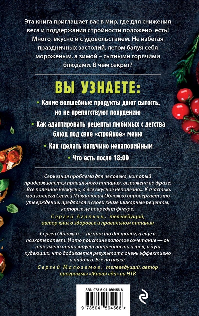 Книга рецептов от Сергея Обложко, врача-психотерапевта, диетолога, специалиста по снижению веса, автора книги «Мозг против похудения». К вашим услугам не только любимый «Оливье» и «Наполеон», но и жареная картошка, и солянка, и ризотто, и даже мороженое! Низкокалорийные и легкие в приготовлении, но не менее вкусные, чем в традиционной версии. И еще более 200 замечательных, вкусных и полезных рецептов. Никогда еще стройность не была такой вкусной. Попробуйте сами. Сергей Обложко, врач-психотерапевт, диетолог, специалист по снижению веса, автор книги «Мозг против похудения», собрал лучшие и проверенные рецепты из своих авторских программ модификации пищевого поведения, чтобы порадовать всех, кто любит вкусное и приталенное одновременно.