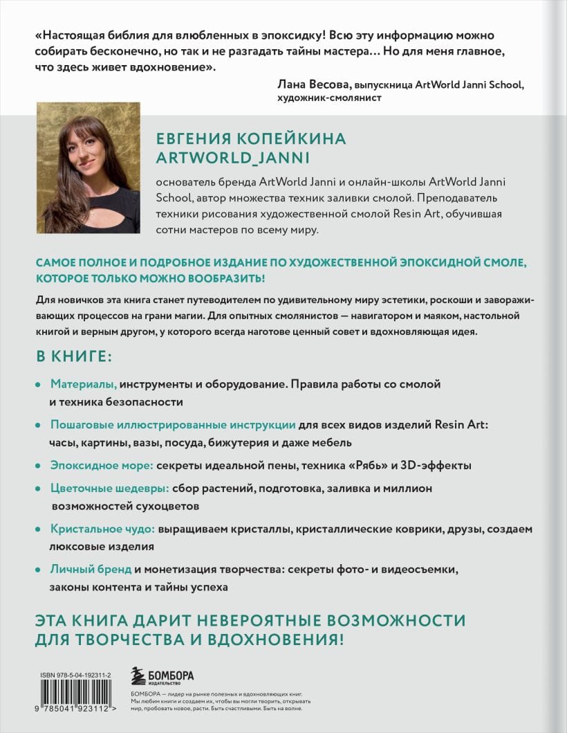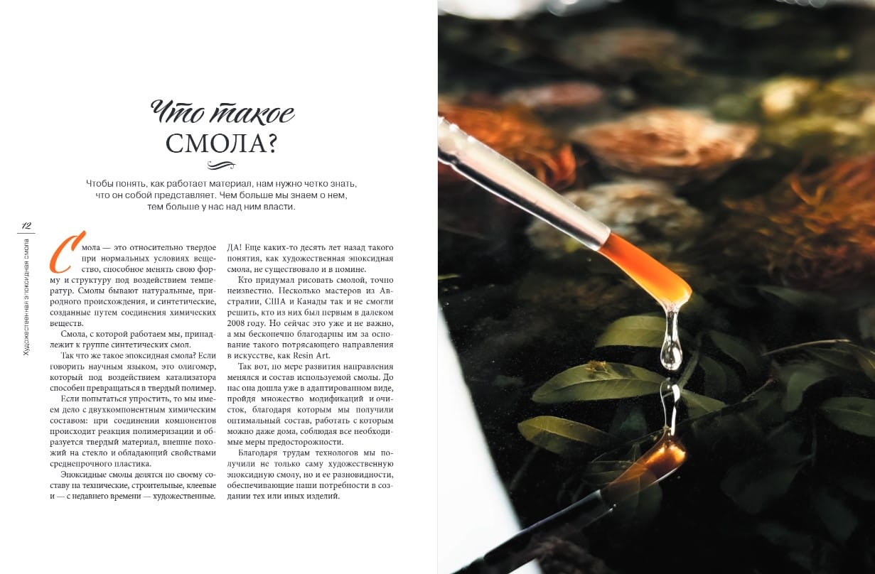 «Настоящая библия для влюбленных в эпоксидку! Всю эту информацию можно собирать бесконечно, но так и не разгадать тайны мастера… Но для меня главное, что здесь живет вдохновение». — Лана Весова, выпускница ArtWorld Janni School, художник-смолянист