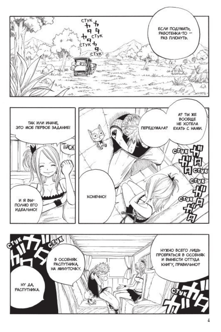 Люси, маг Звездных духов, попавшая в гильдию «Хвост феи», ближе знакомится с новыми товарищами: огненным магом Нацу, котом Хэппи, эксгибиционистом Греем, бабником Локи, пьяницей Каной и другими веселыми чудаками. Поскольку с Нацу и Хэппи она уже успела сдружиться, они объединяются в команду. Вместе они берутся за задание, которое выглядит довольно просто: всего-то и надо, что украсть какую-то книгу… Только вот почему за эту работу предлагают целых двести тысяч самоцветов?
