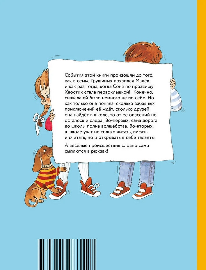События этой книги произошли до того, как в семье Грушиных появился Малёк, и как раз тогда, когда Соня по прозвищу Хвостик стала первоклашкой! Конечно, сначала ей было немного не по себе. Но как только она поняла, сколько забавных приключений её ждёт, сколько друзей она найдёт в школе, то от её опасений не осталось и следа! Во-первых, сама дорога до школы полна волшебства. Во-вторых, в школе учат не только читать, писать и считать, но и открывать в себе таланты. А весёлые происшествия словно сами сыплются в рюкзак!