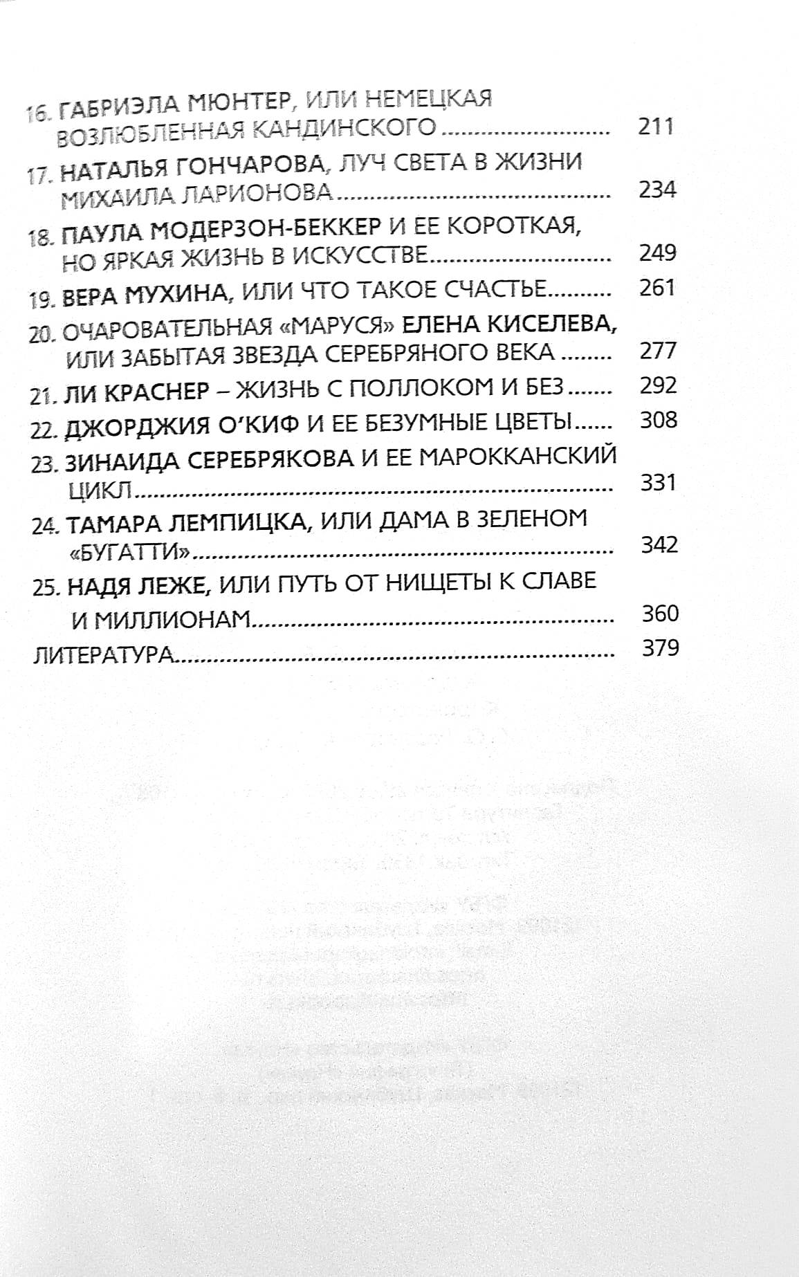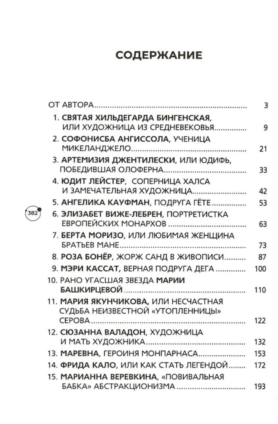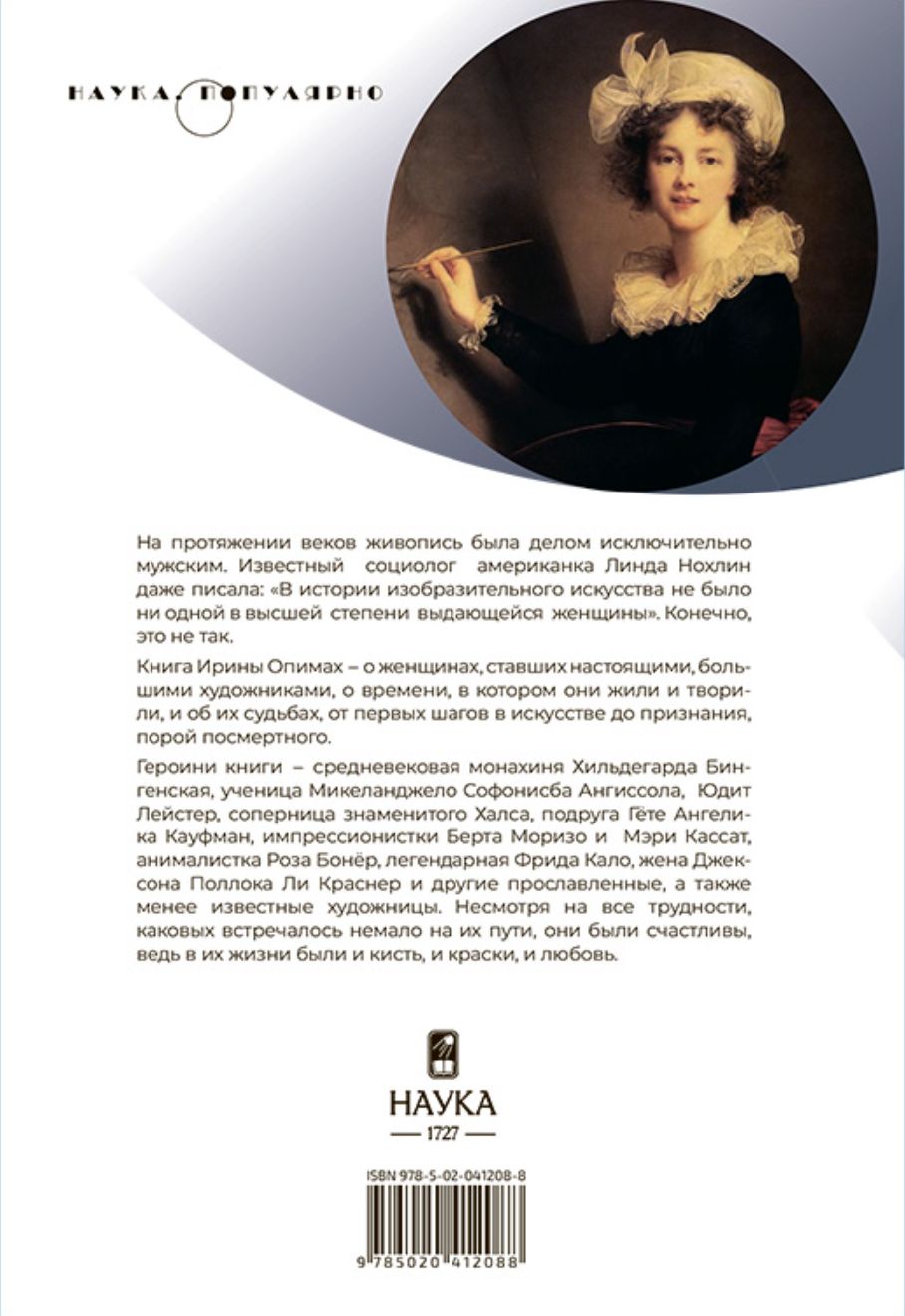 Книга Ирины Опимах, издателя, переводчицы, журналистки — сборник рассказов о художницах, которые, несмотря на социальные барьеры, сопровождающие жизнь женщин во все времена и во всех странах, заняли достойное место в истории искусства. Эти яркие, талантливые дамы доказали, что могут создавать прекрасное не хуже мужчин. Героини книги — средневековая монахиня Хильдегарда Бингенская, ученица Микеланджело Софонисба Ангиссола, подруга Гёте Ангелика Кауфман, импрессионистка Мэри Кассат, анималистка Роза Бонёр, легендарная Фрида Кало, жена Джексона Поллока и сама замечательная художница Ли Краснер, американка Джорджия О’Киф, прославившаяся своими невероятными цветами, и многие другие известные художницы. А объединяет их одно — все они отдали свою жизнь искусству.