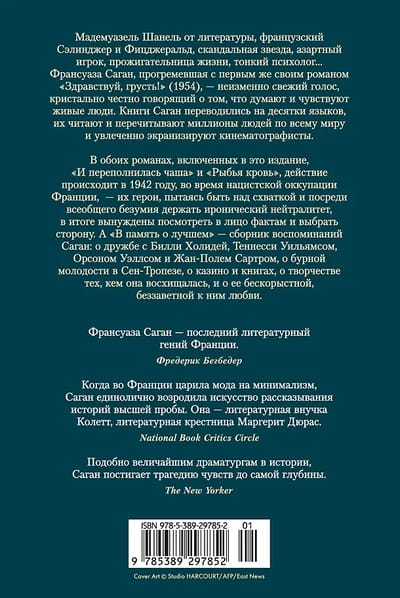 В своих книгах Саган, чутко настроенная на тонкие вибрации каждого дня, который она проживала, обращалась к историческим событиям нечасто. Однако в обоих романах, включенных в это издание, «И переполнилась чаша» и «Рыбья кровь», действие происходит в 1942 году, во время нацистской оккупации Франции, — их герои, пытаясь быть над схваткой и посреди всеобщего безумия держать иронический нейтралитет, в итоге вынуждены посмотреть в лицо фактам и выбрать сторону. А «В память о лучшем» — сборник воспоминаний Саган: о дружбе с Билли Холидей, Теннесси Уильямсом, Орсоном Уэллсом и Жан-Полем Сартром, о бурной молодости в Сен-Тропезе, о казино и книгах, о творчестве тех, кем она восхищалась, и о ее бескорыстной, беззаветной к ним любви.
