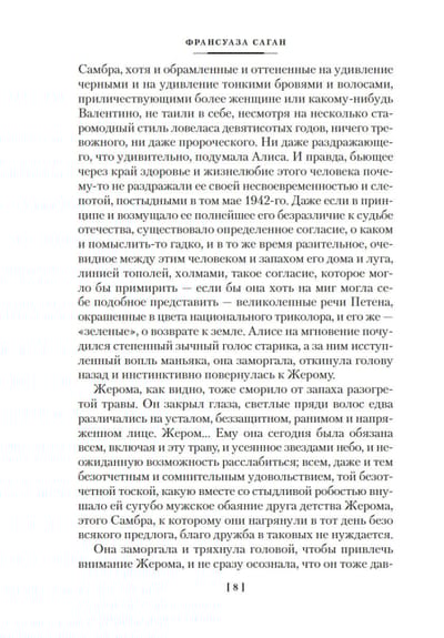 Мадемуазель Шанель от литературы, французский Сэлинджер и Фицджеральд, литературная внучка Колетт, литературная крестница Маргерит Дюрас, скандальная звезда, азартный игрок, прожигательница жизни, тонкий психолог... Франсуаза Саган, прогремевшая с первым же своим романом «Здравствуй, грусть!» (1954), — неизменно свежий голос, кристально честно говорящий о том, что думают и чувствуют живые люди. Книги Саган переводились на десятки языков, их читают и перечитывают миллионы людей по всему миру и увлеченно экранизируют кинематографисты.