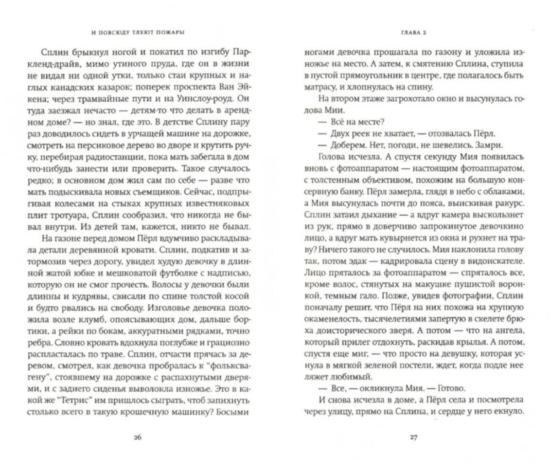 Летом в Шейкер-Хайтс только и говорили о том, что Изабелл, младшенькая Ричардсонов, все-таки спятила и спалила дом… В Шейкер-Хайтс, спокойном и респектабельном городке все тщательно спланировано - от уличных поворотов и цветников у домов до успешных жизней его обитателей. И никто не олицетворяет дух городка больше, чем миссис Ричардсон, идеальная мать и жена. Но однажды в этом царстве упорядоченной жизни появляется художница Мия Уоррен. У миссис Ричардсон - роскошный дом, жилище Мии - маленький «фольксваген-кролик». У одной есть все, но живет она в клетке из правил. У другой нет ничего, но она свободна как ветер. И в то же время, так ли уж далеки они друг от друга? У обеих - дети-подростки, в которых до поры до времени тлеют пожары, и однажды пламя с ревом вырвется и попытается поглотить все вокруг. Столкновение двух миров - порядка и хаоса - окажется сокрушительным для обеих и в то же время подарит новую надежду. Новый роман - это захватывающая история двух семей, в которой много пластов, нет деления на черное и белое, нет деления на героев и антигероев. В книге сплетена сложная сеть - из нравственных принципов, чувств, амбиций, ошибок прошлого.