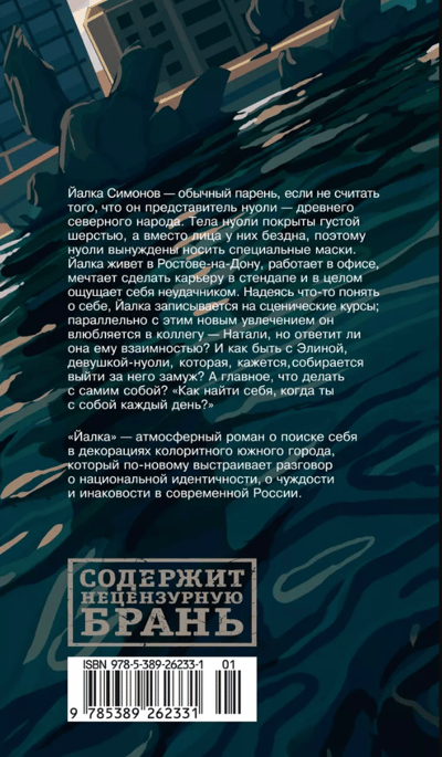 Йалка Симонов — обычный парень, если не считать того, что он представитель нуоли — древнего северного народа. Тела нуоли покрыты густой шерстью, а вместо лица у них бездна, поэтому нуоли вынуждены носить специальные маски. Йалка живет в Ростове-на-Дону, работает в офисе, мечтает сделать карьеру в стендапе (пока получается не очень) и в целом ощущает себя неудачником. Но Йалка отлично знает, что ему никогда не удастся слиться с окружающим ландшафтом: он слишком не похож на остальных. Впрочем, и от культуры нуоли Йалка отдаляется все больше. Единственный ритуал, который он неукоснительно выполняет, — купание в холодной воде (не важно, в ванне или реке): это придает ему сил. Надеясь что-то понять о себе, Йалка записывается на сценические курсы; параллельно с этим новым увлечением он влюбляется в коллегу — Натали, но ответит ли она ему взаимностью? И как быть с Элиной, девушкой-нуоли, которая, кажется, собирается выйти за него замуж? А главное, что делать с самим собой?