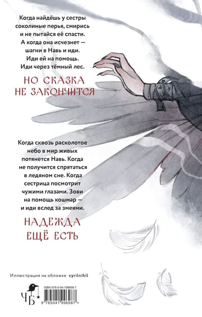 Когда найдешь у сестры соколиные перья, смирись и не пытайся ее спасти. А когда она исчезнет — шагни в Навь и иди. Иди ей на помощь. Иди через темный лес. Но сказка не закончится. Когда сквозь расколотое небо в мир живых потянется Навь. Когда не получится спрятаться в ледяном сне. Когда сестрица посмотрит чужими глазами. Зови на помощь кошмар — и иди вслед за змеями. Надежда еще есть.