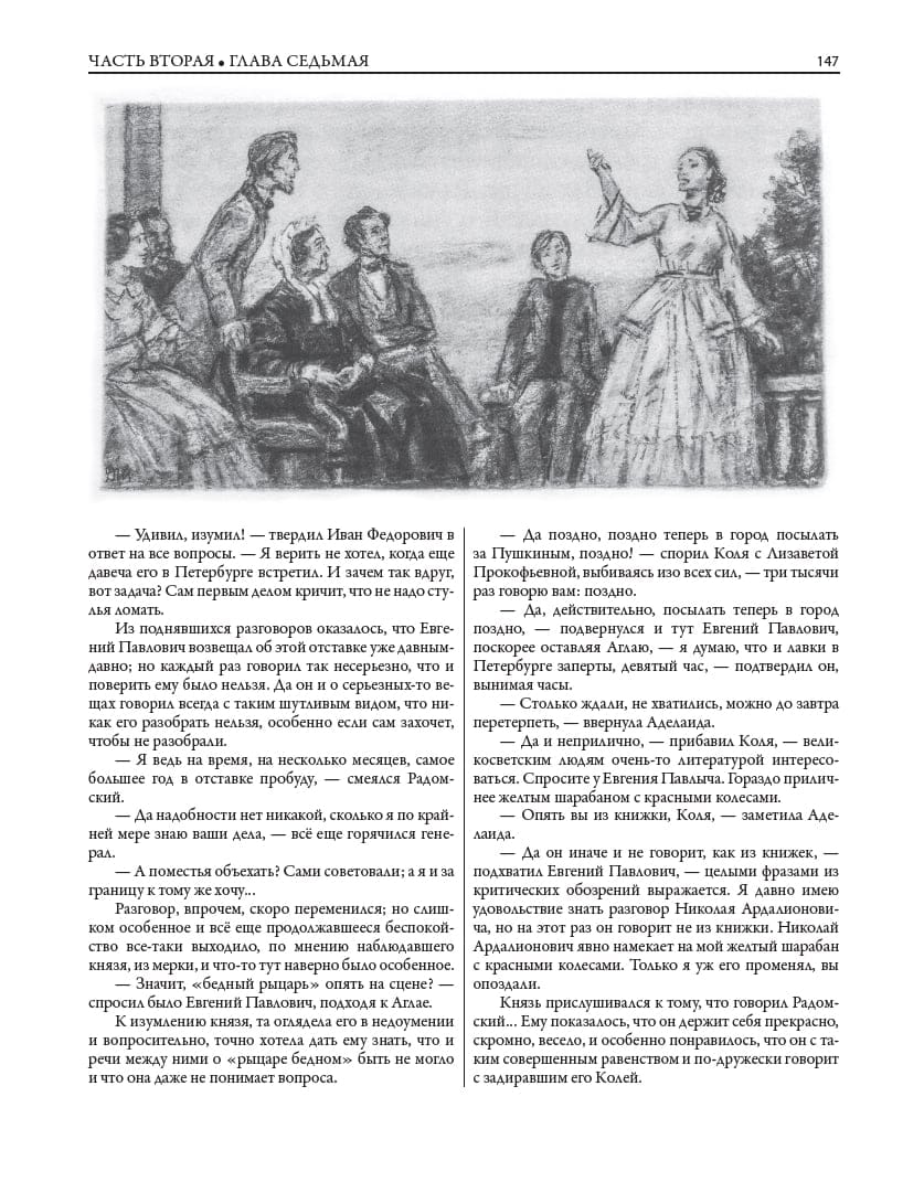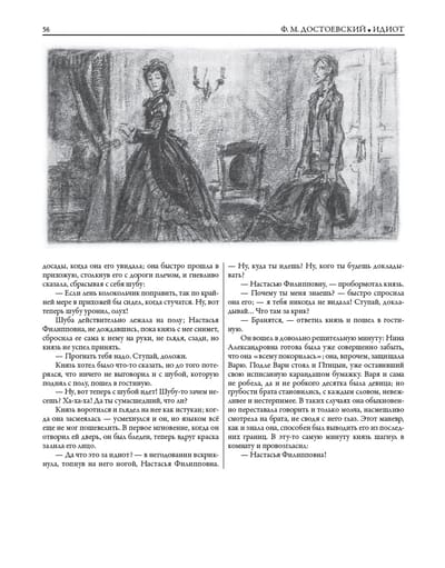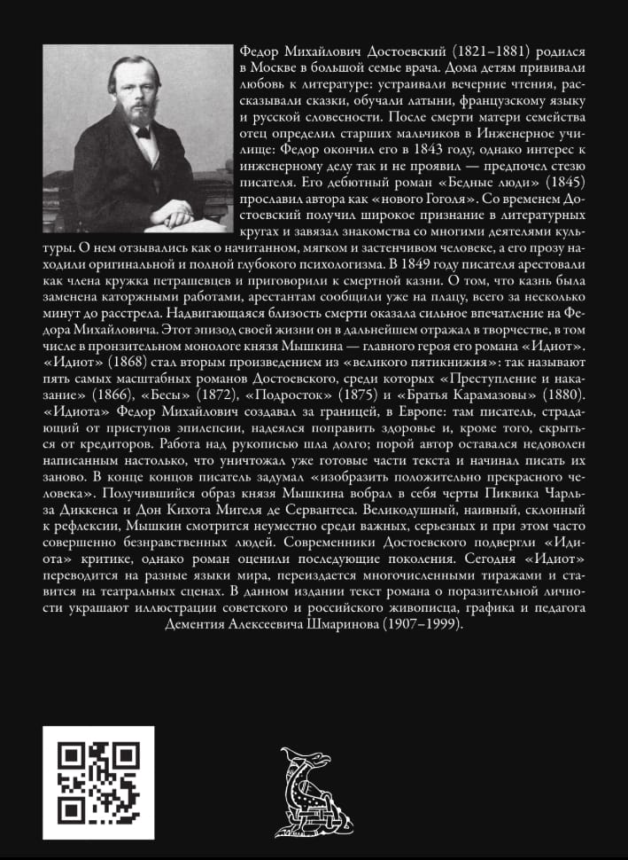 Сегодня «Идиот» переводится на разные языки мира, переиздается многочисленными тиражами и ставится на театральных сценах. В данном издании текст романа о поразительной личности украшают иллюстрации советского и российского живописца, графика и педагога Дементия Алексеевича Шмаринова (1907–1999).