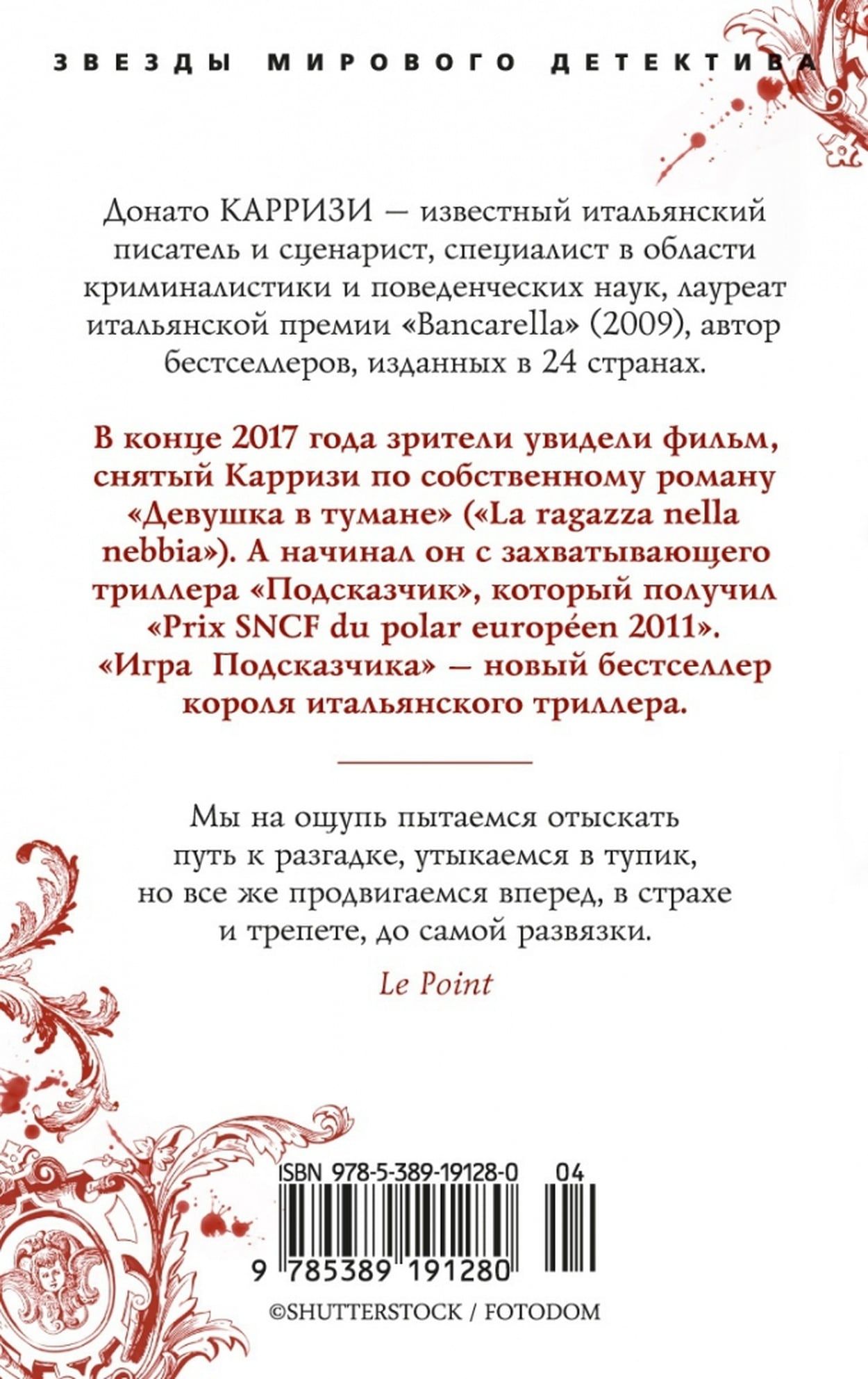 «Игра Подсказчика» — бестселлер Донато Карризи, короля итальянского триллера. Поздно вечером в полиции раздался звонок. Перепуганная женщина сообщила, что перед их домом стоит странный незнакомец, и попросила о помощи. Полицейский патруль, добравшийся на ферму лишь спустя несколько часов, обнаружил, что пол и стены залиты кровью. Обитателей дома постигла печальная участь, но где тела жертв и кто убийца?.. Есть только один человек, способный раскрыть таинственное преступление, это Мила Васкес, но она больше не служит в полиции. Стремясь обрести покой, она поселилась с дочкой Алисой в домике на берегу озера. И все же ей приходится ввязаться в жестокую игру — игру, которую ведет Подсказчик, загадочный персонаж, превращающий людей в марионеток, исполняющих его волю. Она уже сталкивалась с ним, расследуя дело об исчезнувших девочках. Мила Васкес принимает вызов. Слишком многое поставлено на карту, в том числе жизнь ее дочери…