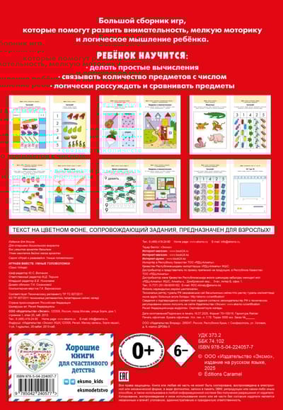 Проведите время с ребенком весело и познавательно! Перед вами — большой сборник развивающих игр для совместных занятий с ребенком возраста от 4 лет. Упражнения, включенные в сборник, направлены на развитие логического мышления, мелкой моторики и внимательности. Внутри вы найдете лабиринты, раскраски по номерам, игры на вычисление количества предметов и на понимание противоположных понятий, а также другие задания, которые малышу обязательно захочется пройти. Каждая игра сопровождается кратким описанием для родителей. Яркие цветные крупные иллюстрации, расположенные на каждой странице, привлекут внимание и заинтересуют ребенка.