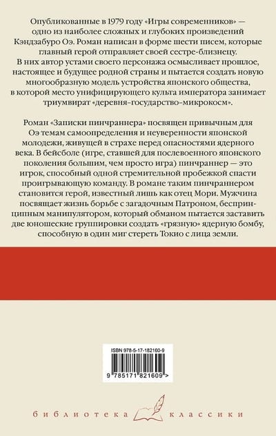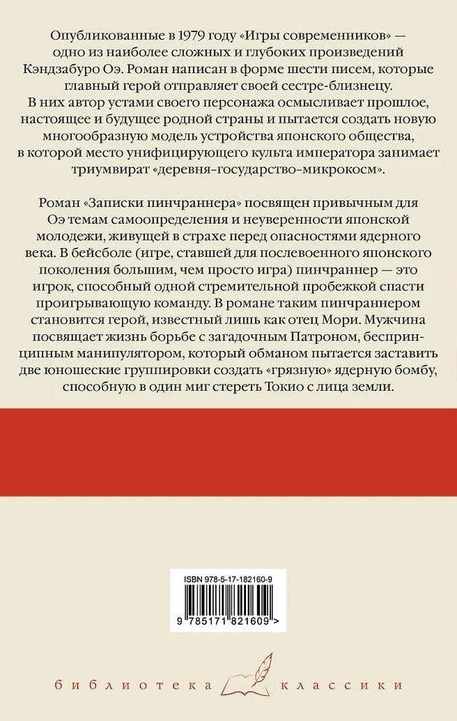 Опубликованные в 1979 году «Игры современников» — одно из наиболее сложных и глубоких произведений Кэндзабуро Оэ. Роман написан в форме шести писем, которые главный герой отправляет своей сестре-близнецу. В них автор устами своего персонажа осмысливает прошлое, настоящее и будущее родной страны и пытается создать новую многообразную модель устройства японского общества, в которой место унифицирующего культа императора занимает триумвират «деревня-государство-микрокосм».