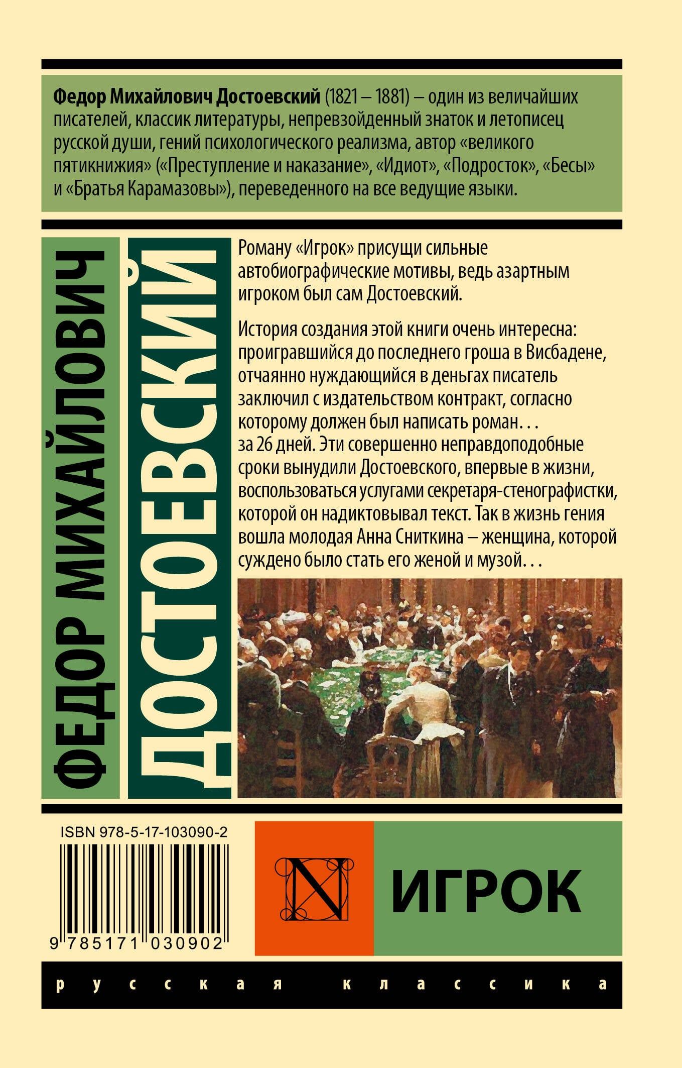 Роману «Игрок» присущи сильные автобиографические мотивы, ведь азартным игроком был сам Достоевский. История создания этой книги очень интересна: проигравшийся до последнего гроша в Висбадене, отчаянно нуждающийся в деньгах писатель заключил с издательством контракт, согласно которому должен был написать роман... за 26 дней. Эти совершенно неправдоподобные сроки вынудили Достоевского, впервые в жизни, воспользоваться услугами секретаря-стенографистки, которой он надиктовывал текст. Так в жизнь гения вошла молодая Анна Сниткина — женщина, которой суждено было стать его женой и музой...