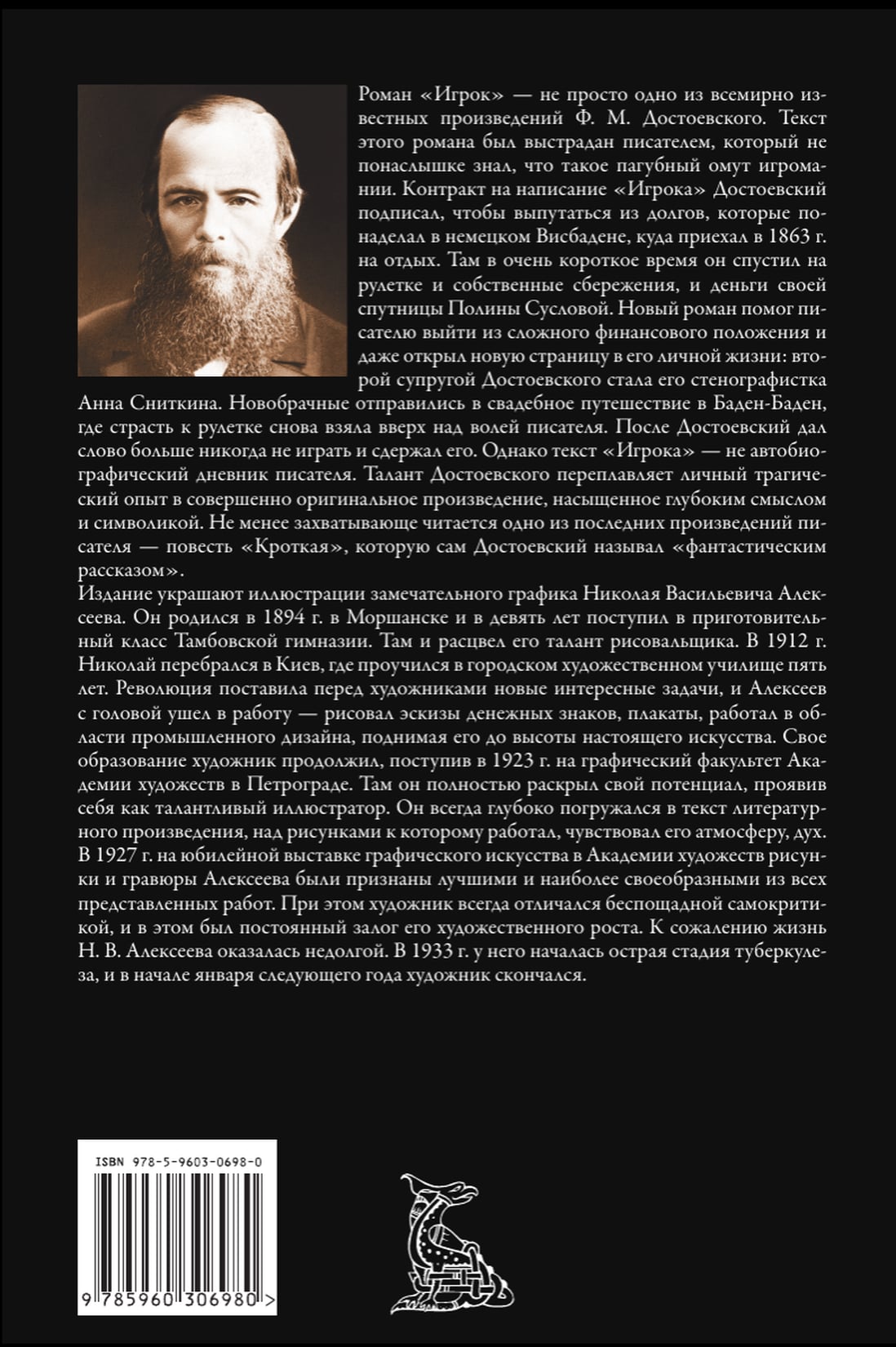 В данный сборник всемирно известного русского классика Ф. М. Достоевского включены его знаменитый роман «Игрок» и одно из последних произведений писателя — повесть «Кроткая», которую сам писатель называл «фантастическим рассказом». Иллюстрации в книге выполнены одним из самых талантливых художников-графиков первой трети XX в. Николаем Васильевичем Алексеевым. В приложении в сборнику даны обзорные статьи о творчестве этого мастера, написанные К. Фединым, Э. Голлербахом, а также А. Корниловым.