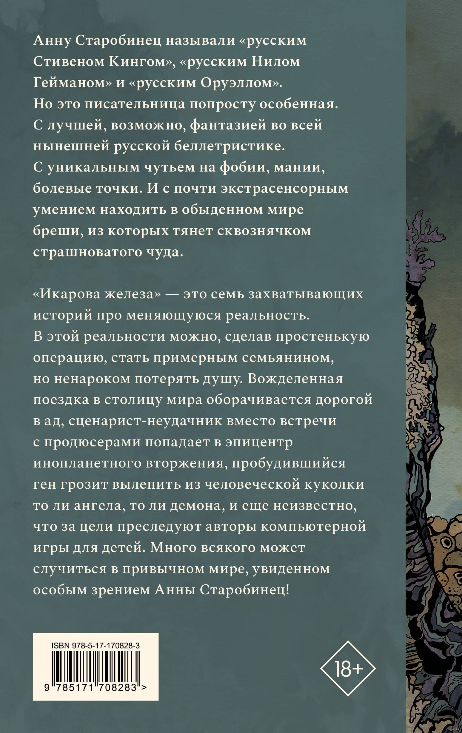 «Икарова железа» — это семь захватывающих историй про меняющуюся реальность. В этой реальности можно, сделав простенькую операцию, стать примерным семьянином, но ненароком потерять душу. Вожделенная поездка в столицу мира оборачивается дорогой в ад, сценарист-неудачник вместо встречи с продюсерами попадает в эпицентр инопланетного вторжения, пробудившийся ген грозит вылепить из человеческой куколки то ли ангела, то ли демона, и еще неизвестно, что за цели преследуют авторы компьютерной игры для детей. Много всякого может случиться в привычном мире, увиденном особым зрением Анны Старобинец!