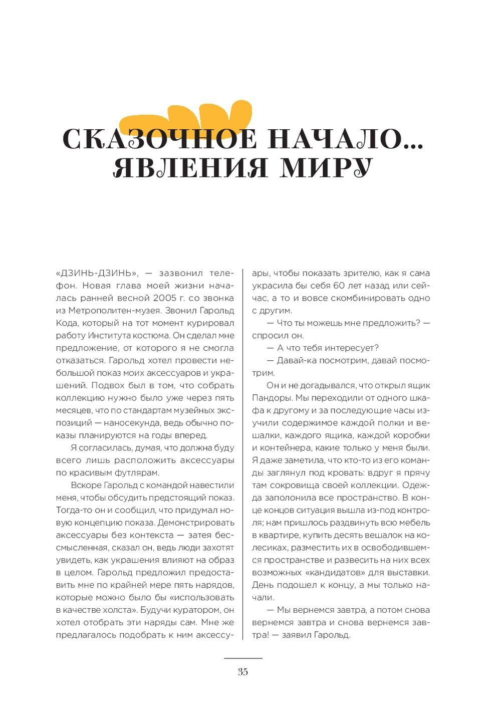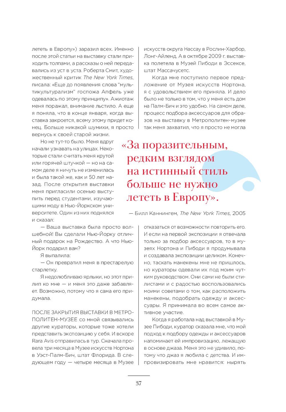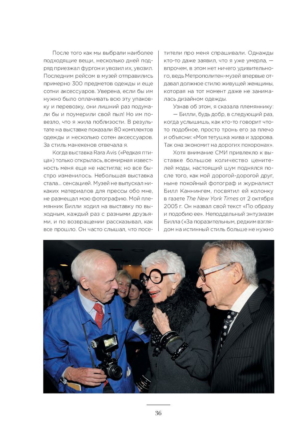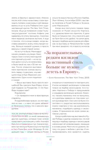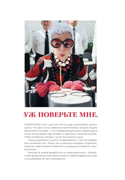 Айрис Апфель — муза мировых дизайнеров, обладательница невероятного гардероба и коллекции необычных украшений. Одна из самых экстравагантных личностей мира моды и «первая леди текстиля» живет так, как считает нужным, отметая в сторону мысли о возрастных «приличиях» и заражая оптимизмом всех, с кем общается. О ней снимают кино и постоянно пишут в глянце, Mattel выпускает Barbie в ее образах. У Айрис миллионы поклонников по всему миру. В свои 97 она заключила контракт с агентством IMG, работающим с Беллой Хадид, Жизель Бюндхен и другими топ-моделями. Ее боготворят Дрис ван Нотен, Брюс Вебер, Канье Уэст и все селебрити. Самое удивительное, что Айрис никогда не искала популярности, а иконой стиля стала по воле случая. Книга Айрис Апфель такая же яркая и прекрасная, как ее автор. Здесь есть советы и жизненные правила, случаи из детства, истории из настоящего, описания нарядов, тканей и аксессуаров, исторические события, участницей которых была Айрис, размышления о жизни, любви и людях, очерки о стиле и рассуждения на самые разные темы. Страницы, каждая из которых достойна висеть в рамке на стене, украшают фотографии из личного архива Айрис, а также работы лучших фотографов и художников мира моды.