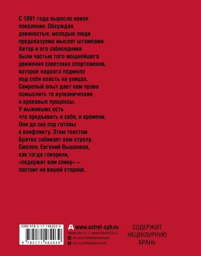 С 1991 года выросло новое поколение. Обсуждая девяностые, молодые люди предсказуемо мыслят штампами. Автор и его собеседники были частью того мощнейшего движения советских спортсменов, которое надолго подмяло под себя власть на улицах. Свирепый опыт дает нам право осмыслить те вулканические и кровавые процессы. У выживших есть что предъявить и себе, и времени. Они до сих пор готовы к конфликту. Этим текстом Братва забивает вам стрелу. Смелее. Евгений Вышенков, как тогда говорили, «подержит вам спину» — постоит на вашей стороне.