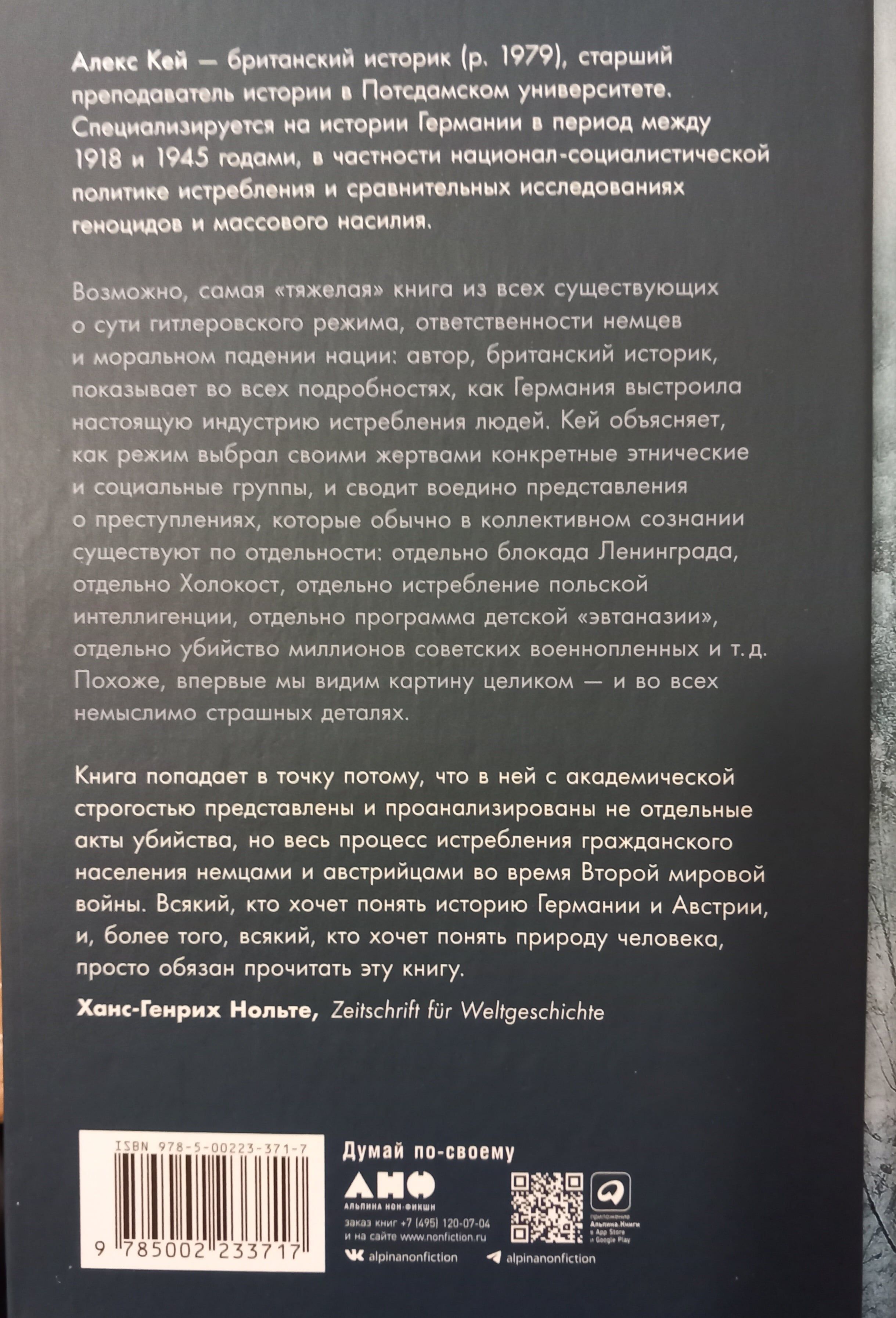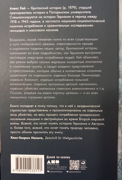 Возможно, самая «тяжелая» книга из всех посвященных сути гитлеровского режима и ответственности немцев. Британский историк Алекс Кей доказывает, что умерщвление людей, принадлежащих к некоторым этническим и социальным группам, было в нацистской Германии не побочным продуктом репрессивной политики – но главным. Автор объясняет, как режим выбирал своими жертвами конкретные этнические и социальные группы, и сшивает в одно целое те представления о совершенных нацистами преступлениях, которые обычно существуют в коллективном сознании по отдельности: блокада Ленинграда, холокост, истребление польской интеллигенции, программа детской «эвтаназии» и т.д. Впервые мы видим картину целиком – и во всех немыслимо страшных деталях.