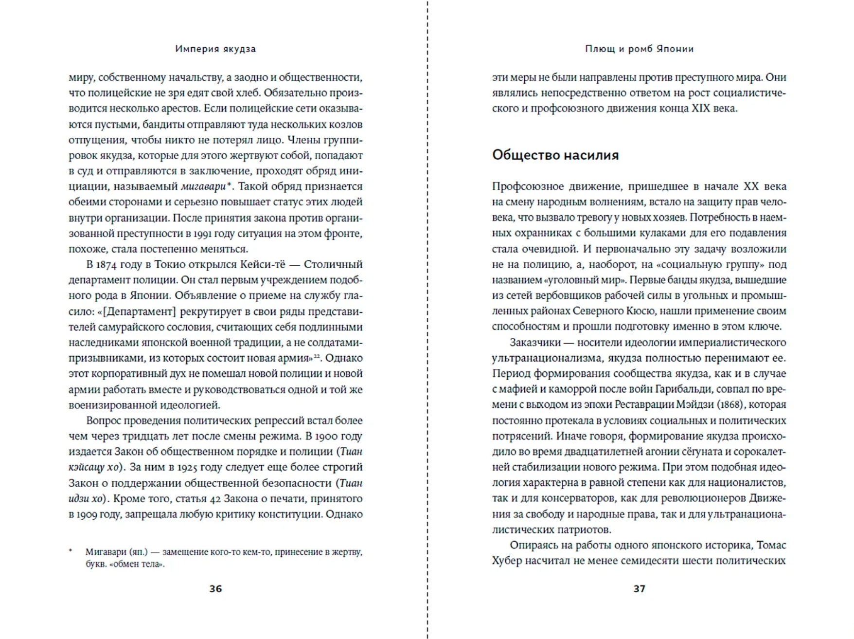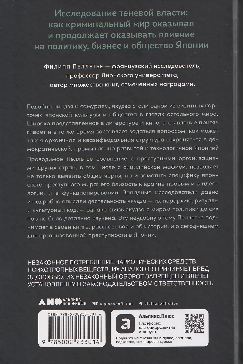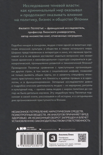 Подобно ниндзя и самураям, якудза стали одной из «визитных карточек» японской культуры и общества в глазах остального мира. Широко представленное в литературе и кино, это явление притягивает и в то же время заставляет задаться вопросом: как может такая архаичная и квазифеодальная структура сохраняться в демократической, промышленно развитой и технологичной Японии? Проводимое Пеллетье сравнение с преступными организациями других стран, особенно с сицилийской мафией, позволяет выявить общие черты, но также заметить и специфику японского преступного мира: его близость к крайне правым и в идеологии, и в функционировании. Западные исследователи давно и подробно описали деятельность якудза, их иерархию, ритуалы, культурные коды (татуировки, одежду и т.д.). Однако связь якудза с миром политики до сих пор не была детально изучена. Эту «неудобную» тему Пеллетье поднимает в своей книге, рассказывая и об истории, и о сегодняшнем дне организованной преступности в Японии.