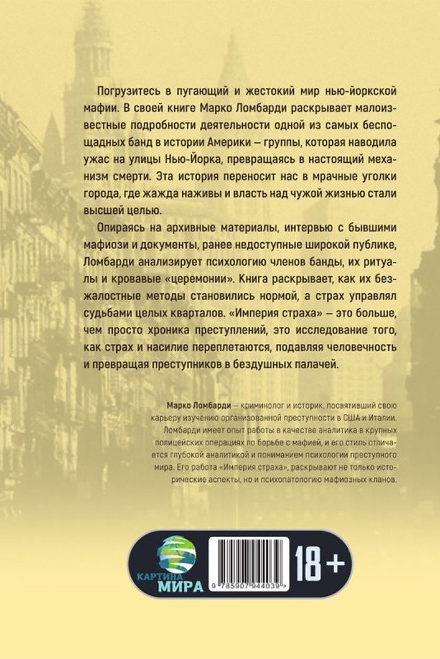 Погрузитесь в пугающий и жестокий мир нью-йорской мафии. В своей книге Марко Ломбарди раскрывает малоизвестные подробности деятельности одной из самых беспощадных банд в истории Америки-группы, которая наводила ужас на улицы Нью-Йорка, превращаясь в настоящий механизм смерти. Эта история переносит нас в мрачные уголки города, где жажда наживы и власти над чужой жизнью стали высшей целью.