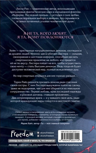 Листера — сильная, своенравная и жестокая инферия, способная наслать смертоносное проклятие на любого, кто придется ей не по вкусу. Именно ее привязывает к себе Торен Райз, решившийся призвать демона ради спасения сестры. Листера и Торен заключают сделку, но чем обернется их невольное сотрудничество, покажет только время...