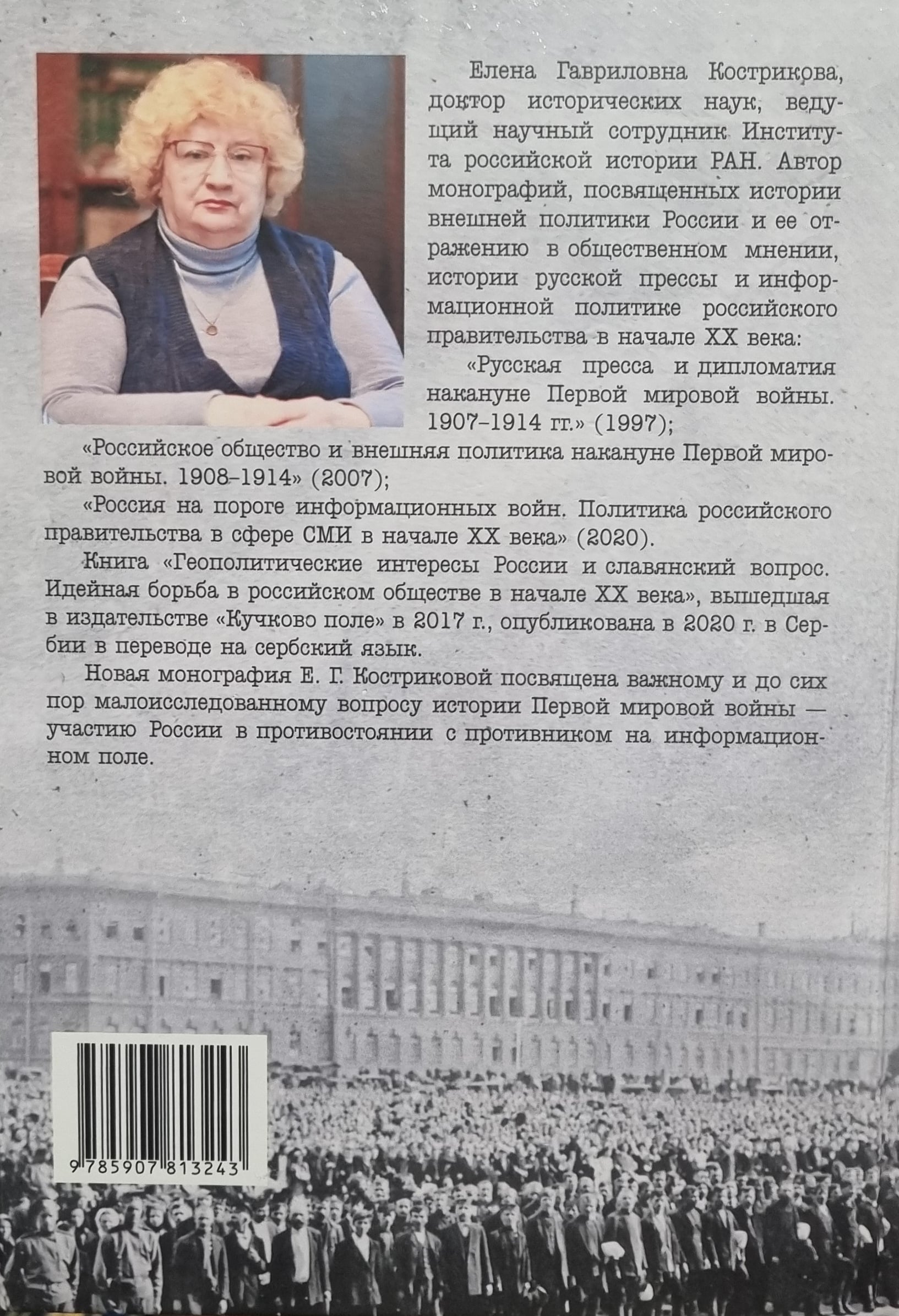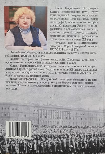 Книга Е.Г. Костриковой посвящена важному и до сих пор малоисследованному вопросу истории Первой мировой войны — участию России в противостоянии с противником на информационном поле. В первой части книги рассматривается деятельность государственных структур, отвечавших за информационную безопасность Российской империи, в первую очередь Петроградского телеграфного агентства (ПТА) — главного информационного ресурса царского правительства. Для прессы ПТА было основным источником сообщений о событиях на фронте и в тылу. В тесном сотрудничестве с МИД агентство развернуло активную работу в нейтральных странах, противодействуя вражеской агитации и распространяя позитивную информацию о России.