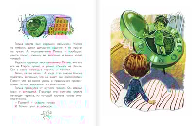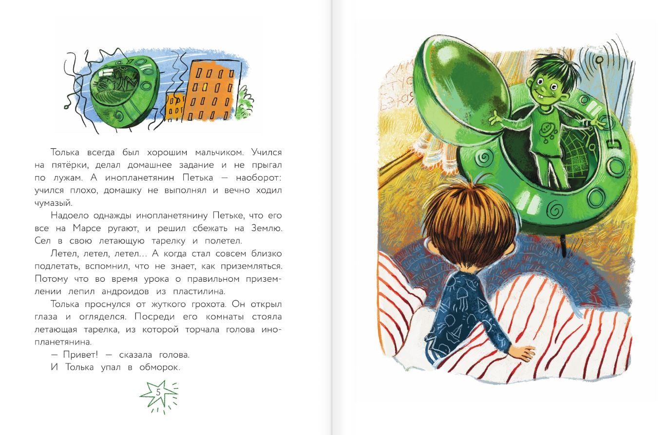 Однажды к обычному школьнику Тольке прилетел на летающей тарелке таинственный друг — марсианин Петька. Он совсем как Толька, разве что зелёный и с хвостом. Впрочем, если хвост заправить в брюки, а зелёный цвет объяснить происхождением из города Зеленогорска, то можно друга даже в школу отвести — никто ничего не заподозрит. Правда, нравы на Марсе ну совсем не как на Земле — кошками у нас не кидаются и в ухо суп не наливают. А вот хулиган — он и на Марсе хулиган. Хорошо, что и у марсиан есть любящие мамы и папы, которые вовремя прилетят и заберут ребёночка домой.