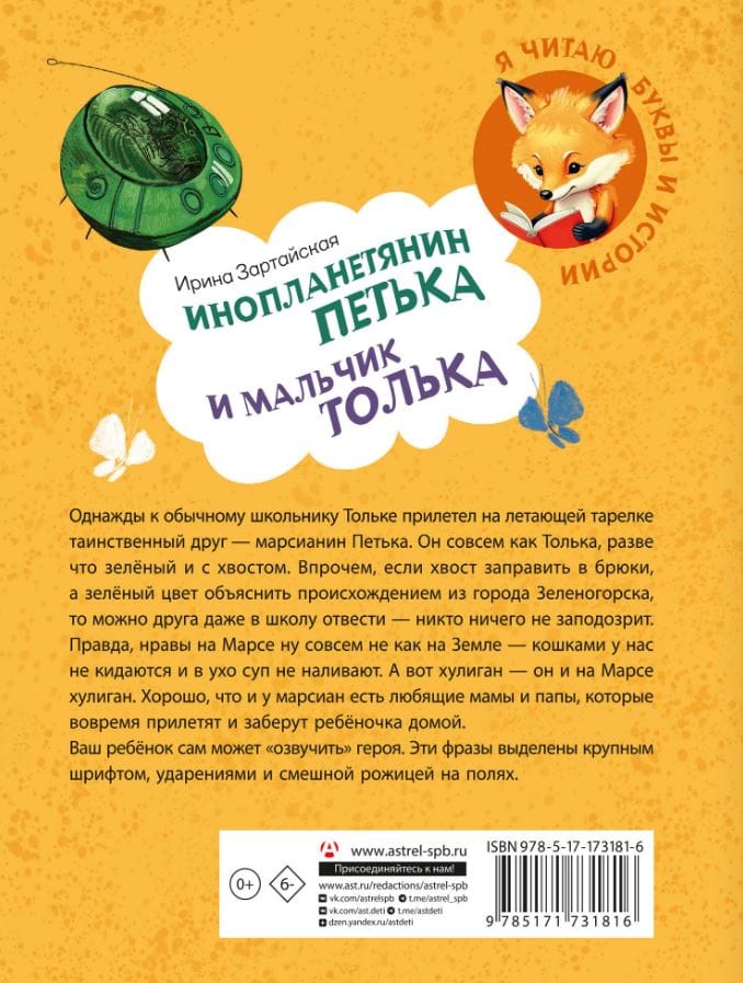 «Инопланетянин Петька и мальчик Толька» — точное попадание в мир начинающих читателей. Любому из них будет интересно «озвучить» героя такой книги. Это удобно — тесты для чтения ребенком специально выделены более крупным шрифтом и смешной рожицей. В них проставлены ударения. И их немного, поэтому количество строк не напугает на старте.