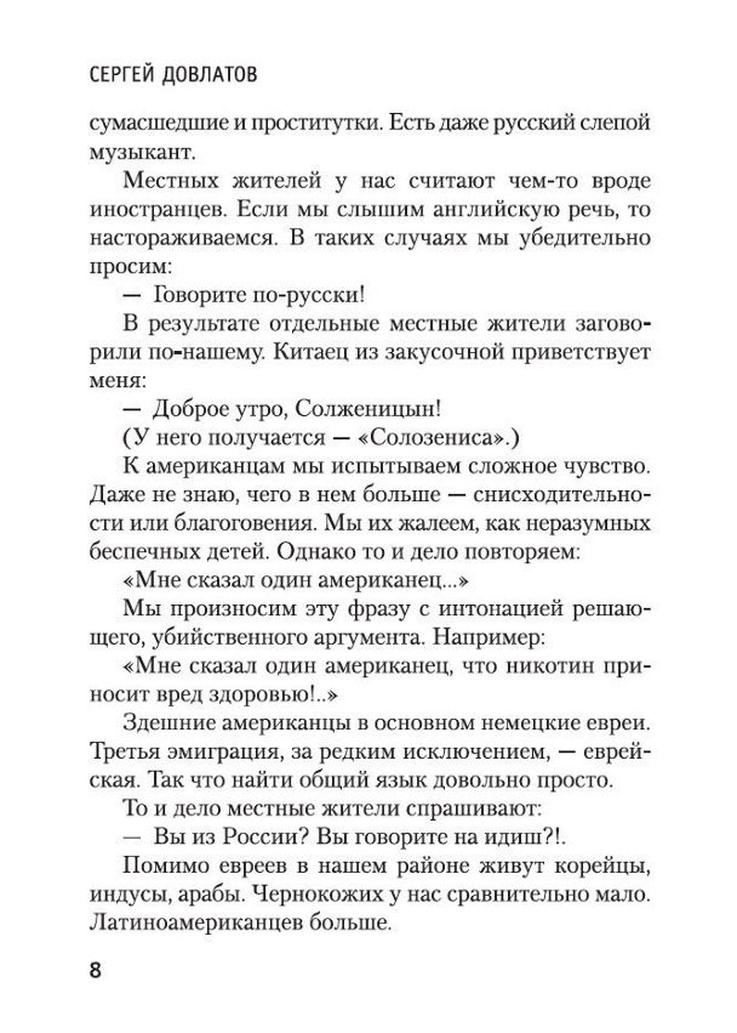 События повести Сергей Довлатова «Иностранка», написанной в 1985-1986 годах, происходят в русском районе Нью-Йорка, где проживал и сам автор. Вот как описывает Довлатов этот своеобразный, веселый островок: «Мы — это шесть кирпичных зданий вокруг супермаркета, населенных преимущественно русскими. То есть недавними советскими гражданами. Или, как пишут газеты, — эмигрантами третьей волны... У нас есть русские магазины, детские сады, фотоателье и парикмахерские. Есть русское бюро путешествий. Есть русские адвокаты, писатели, врачи и торговцы недвижимостью. Есть русские гангстеры, сумасшедшие и проститутки. Есть даже русский слепой музыкант».