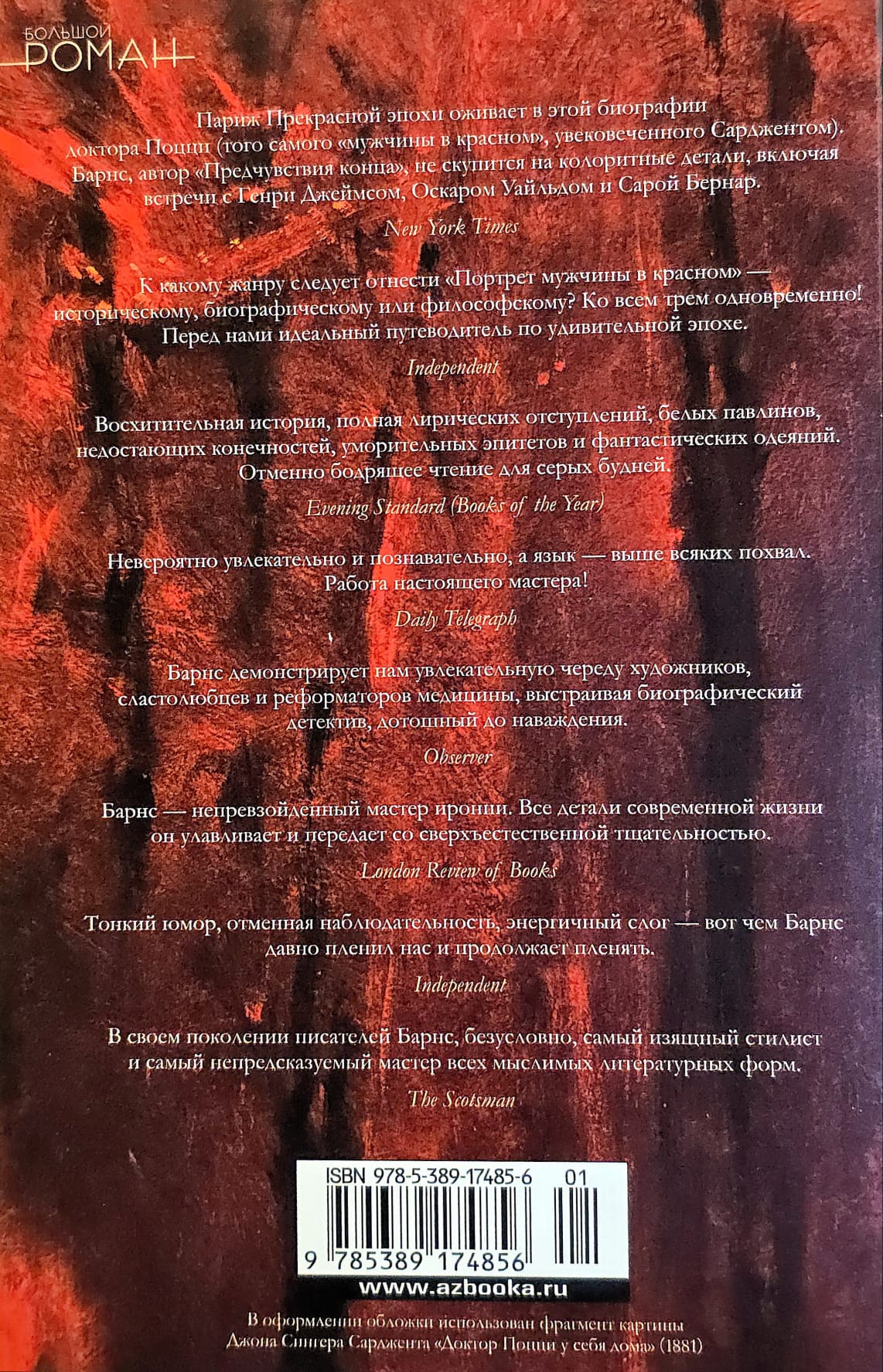 Итак, познакомьтесь с Самюэлем Поцци — модным парижским доктором конца XIX века, отцом современной гинекологии и легендарным бабником; словом, тем самым «мужчиной в красном», изображенным на знаменитом портрете кисти Сарджента «Доктор Поцци у себя дома». Через призму путешествия доктора, снабженного рекомендательным письмом от Сарджента Генри Джеймсу, на Туманный Альбион Барнс рассматривает Belle Époque («Прекрасную эпоху») во всем ее многообразии, и читатель не может не провести тревожных параллелей с днем сегодняшним. Причем едет доктор не один: компанию ему составляют рафинированные аристократы принц де Полиньяк и граф Робер де Монтескью — прототип барона де Шарлюса из эпопеи Пруста «В поисках утраченного времени».