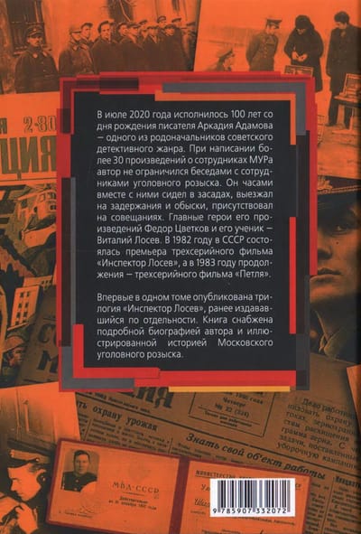 В июле 2020 года исполнилось 100 лет со дня рождения писателя Аркадия Адамова — одного из родоначальников советского детективного жанра. При написании более 30 произведений о сотрудниках МУРа автор не ограничился беседами с сотрудниками уголовного розыска. Он часами вместе с ними сидел в засадах, выезжал на задержания и обыски, присутствовал на совещаниях. Главные герои его произведений Федор Цветков и его ученик — Виталий Лосев. В 1982 году в СССР состоялась премьера трехсерийного фильма «Инспектор Лосев», а в 1983 году продолжения — трехсерийного фильма «Петля». Впервые в одном томе опубликована трилогия «Инспектор Лосев», ранее издававшийся по отдельности. Книга снабжена подробной биографией автора и иллюстрированной историей Московского уголовного розыска.