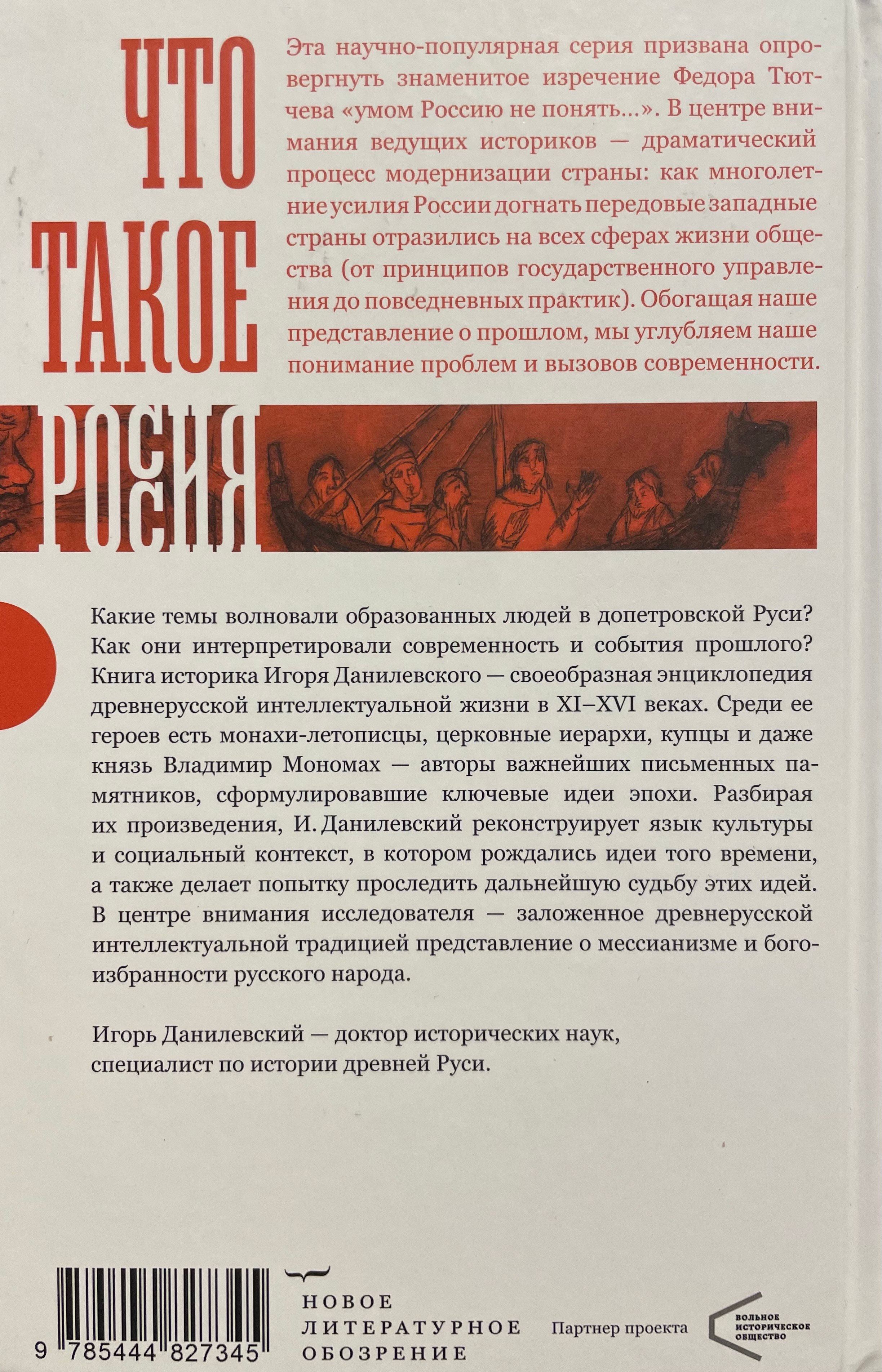Какие темы волновали образованных людей в допетровской Руси? Как они интерпретировали современность и события прошлого? Книга историка Игоря Данилевского — своеобразная энциклопедия древнерусской интеллектуальной жизни в XI–XVI веках. Среди ее героев есть монахи-летописцы, церковные иерархи, купцы и даже князь Владимир Мономах — авторы важнейших письменных памятников, сформулировавшие ключевые идеи эпохи. Разбирая их произведения, И. Данилевский реконструирует язык культуры и социальный контекст, в котором рождались идеи того времени, а также делает попытку проследить дальнейшую судьбу этих идей. В центре внимания исследователя — заложенное древнерусской интеллектуальной традицией представление о мессианизме и богоизбранности русского народа. Игорь Данилевский — доктор исторических наук, специалист по истории древней Руси.