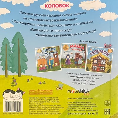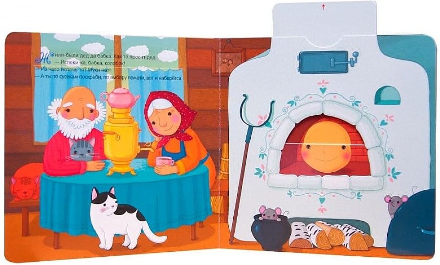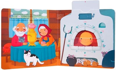 Любимая русская народная сказка о Колобке оживает на страницах интерактивной книги с колесиком, движущимися элементами, окошками и клапанами.