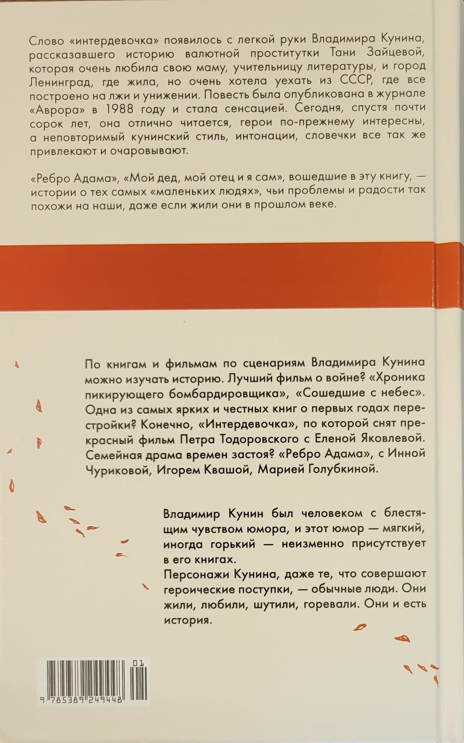 Слово «интердевочка» вошло в наш язык с легкой руки Владимира Кунина; он рассказал историю валютной проститутки Тани Зайцевой, которая очень любила свою маму, учительницу литературы, и город Ленинград, где жила, но очень хотела уехать из СССР, где все построено на лжи и унижении. Повесть была опубликована в журнале «Аврора» в 1988 году и стала сенсацией. Сегодня, спустя, почти сорок лет, она отлично читается, герои по-прежнему интересны и вызывают сочувствие, а неповторимый кунинский стиль, интонации, словечки все так же привлекают очаровывают. «Ребро Адама», «Мой дед, мой отец и я сам», вошедшие в эту книгу, — истории о тех самых «маленьких людях», чьи проблемы и радости так похожи на наши, даже если жили они в прошлом веке.