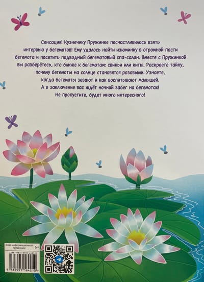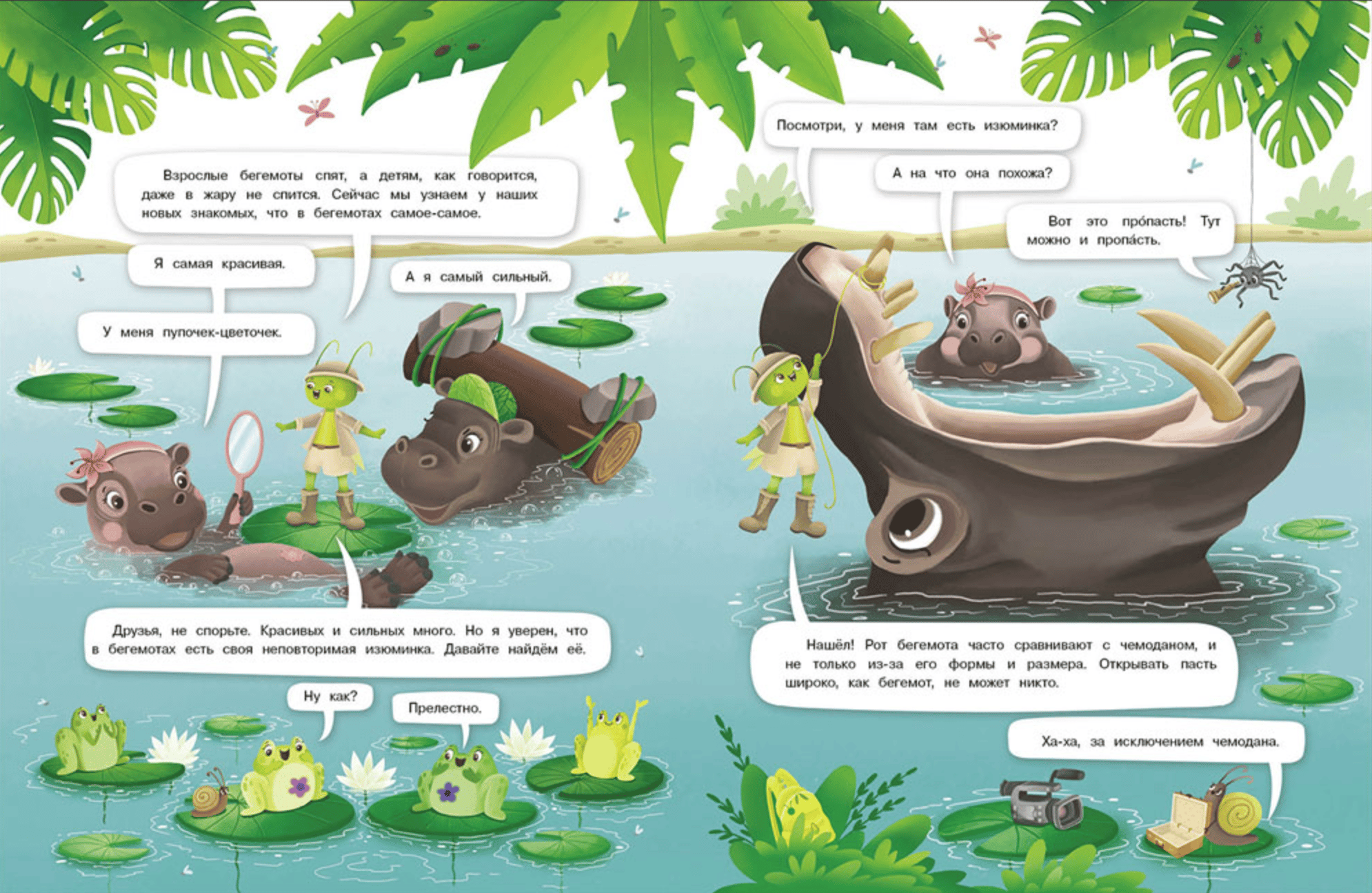 Кузнечик Пружинка – репортер в мире животных. В его волшебном рюкзаке найдется все, что поможет взять интервью у любого животного: и в непроходимых джунглях, и в жаркой Африке глубоко под водой и высоко в небе. В каждом путешествии Пружинку ждут невероятные открытия, новые друзья и удивительные приключения. Репортер Пружинка не испугался сходить на интервью к огромным бегемотам и задать им несколько вопросов.