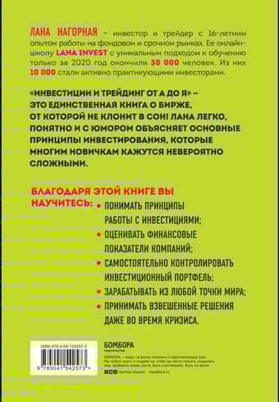 Лана Нагорная — инвестор и трейдер с 16-летним опытом работы на фондовом и срочном рынках. Ее онлайн-школу Lana Invest с уникальным подходом к обучению только за 2020 год окончили 30 000 человек. Из них 10 000 стали активно практикующими инвесторами. «Инвестиции и трейдинг от А до Я» — это единственная книга о бирже, от которой не клонит в сон! Лана легко, понятно и с юмором объясняет основные принципы инвестирования, которые многим новичкам кажутся невероятно сложными.