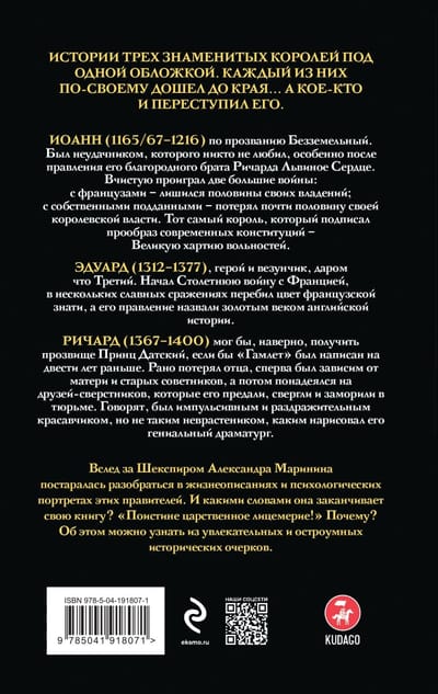 Иоанн (1167—1216) по прозвищу Безземельный. Был неудачником, которого никто не любил, особенно после правления его благородного брата Ричарда Львиное Сердце. Вчистую проиграл две большие войны: с французами — лишился половины своих владений; с собственными подданными — потерял почти половину своей королевской власти. Тот самый король, который подписал прообраз современных конституций — Великую хартию вольностей. Эдуард (1312—1377), герой и везунчик, по прозвищу Третий. Начал Столетнюю войну с Францией, в нескольких славных сраженьях перебил цвет французской знати, а его правление назвали «золотым веком» английской истории. Ричард (1367—1400) мог бы, наверно, получить прозвище Принц Датский, если бы Гамлет был написан на двести лет раньше. Рано потерял отца, сперва был зависим от матери и старых советников, а потом понадеялся на друзей-сверстников, которые его предали, свергли и заморили в тюрьме. Говорят, был импульсивным и раздражительным красавчиком, но не таким неврастеником, каким нарисовал его гениальный драматург. Вслед за Шекспиром Александра Маринина постаралась разобраться в жизнеописаниях и психологических портретах этих правителей. И какими словами она заканчивает свою книгу? «Поистине царственное лицемерие». Почему? Об этом можно узнать из увлекательных и остроумных исторических очерков.
