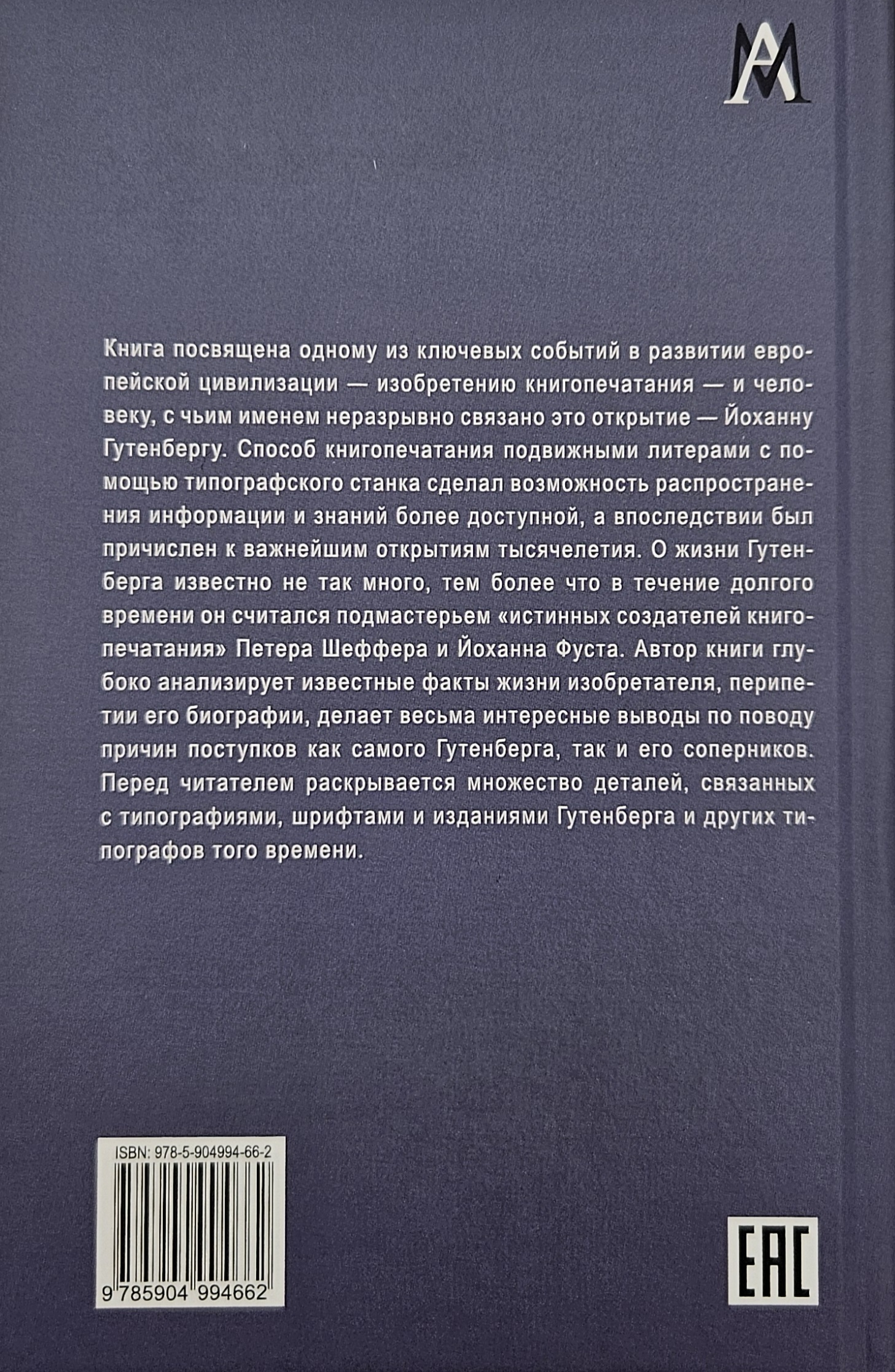 Книга посвящена одному из ключевых событий в развитии европейской цивилизации — изобретению книгопечатания — и человеку, с чьим именем неразрывно связано это открытие — Йоханну Гутенбергу. Способ книгопечатания подвижными литерами с помощью типографского станка сделал возможность распространения информации и знаний более доступной, а впоследствии был причислен к важнейшим открытиям тысячелетия. О жизни Гутенберга известно не так много, тем более что в течение долгого времени он считался подмастерьем «истинных создателей книгопечатания» Петера Шеффера и Йоханна Фуста. Автор книги глубоко анализирует известные факты жизни изобретателя, перипетии его биографии, делает весьма интересные выводы по поводу причин поступков как самого Гутенберга, так и его соперников. Перед читателем раскрывается множество деталей, связанных с типографиями, шрифтами и изданиями Гутенберга и других типографов того времени.