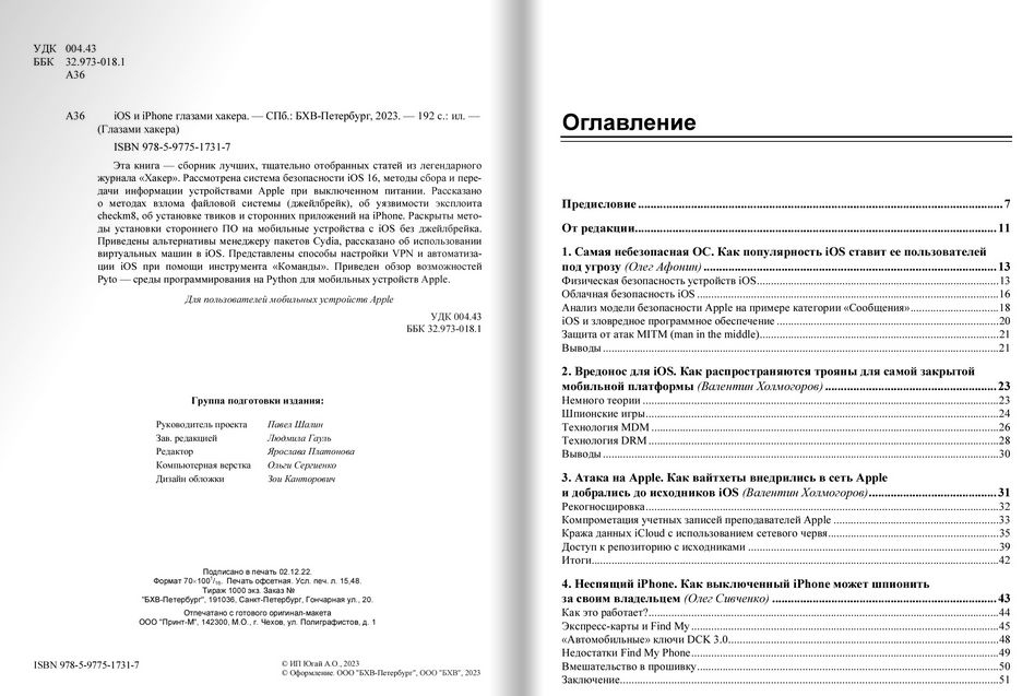 Эта книга - сборник лучших, тщательно отобранных статей из легендарного журнала «Хакер». Рассмотрена система безопасности iOS 16, методы сбора и передачи информации устройствами Apple при выключенном питании. Расска-зано о методах взлома файловой системы (джейлбрейк), об уязвимости эксплои-та checkm8, об установке твиков и сторонних приложений на iPhone. Раскрыты методы установки стороннего ПО на мобильные устройства с iOS без джейл-брейка. Приведены альтернативы менеджеру пакетов Cydia, рассказано об использова-нии виртуальных машин в iOS. Представлены способы настройки VPN и автома-тизации iOS при помощи инструмента «Команды». Приведен обзор возможностей Pyto - среды программирования на Python для мобильных устройств Apple.