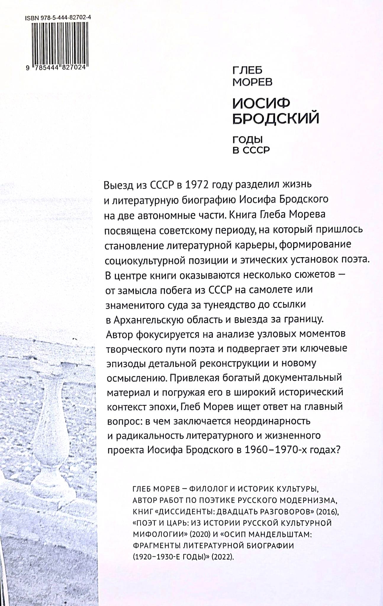 Автор фокусируется на анализе узловых моментов творческого пути поэта и подвергает эти ключевые эпизоды детальной реконструкции и новому осмыслению. Привлекая богатый документальный материал и погружая его в широкий исторический контекст эпохи, Глеб Морев ищет ответ на главный вопрос: в чем заключается неординарность и радикальность литературного и жизненного проекта Иосифа Бродского в 1960–1970 х годах? Глеб Морев — филолог и историк культуры, автор работ по поэтике русского модернизма, книг «Диссиденты: Двадцать разговоров» (2016), «Поэт и Царь: Из истории русской культурной мифологии» (2020) и «Осип Мандельштам: Фрагменты литературной биографии (1920–1930 е годы)» (2022).