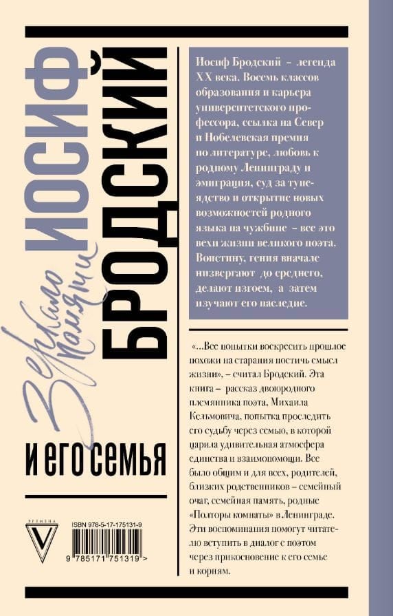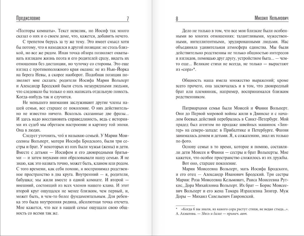 Эта книга – рассказ двоюродного племянника Иосифа Бродского, Михаила Кельмовича, попытка проследить судьбу поэта через его семью, в которой царила удивительная атмосфера единства и взаимопомощи. Все было общим и для всех, родителей, близких родственников - семейный очаг, семейная память, родные «полторы комнаты» в Ленинграде.
