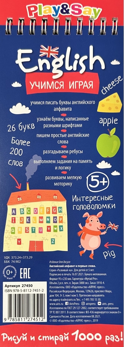 Многоразовые прописи по английскому языку знакомят ребенка с английским алфавитом и первыми словами из лексики начальной школы (более 200 слов по основным темам). Ребенок научится узнавать буквы, написанные разными шрифтами, потренируется писать слова, выучит их, научится употреблять слова в правильном контексте - и все это в игровой форме. Задания на внимание, логику и память не дадут ему заскучать. Прописи также помогут развить мелкую моторику. Специальное покрытие страничек позволяет писать и стирать неограниченное количество раз. Издание адресовано детям старше 5 лет.