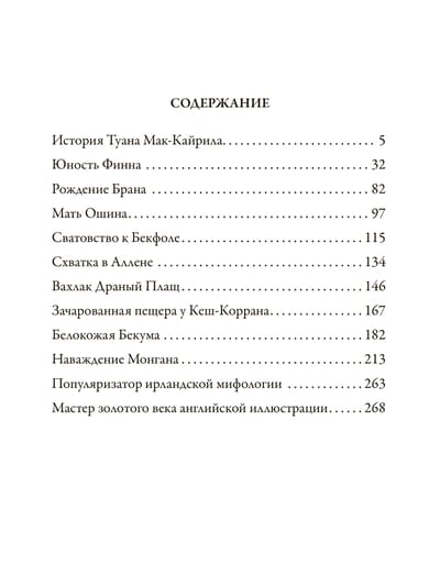 Издание включает десять ирландских мифов, переработанных и записанных самобытным ирландским писателем Джеймсом Стивенсом. В  его талантливом изложении эти древние предания обрели оригинальную стилистику и насытились яркими метафорами. По этим текстам Стивенса и по сей день интересно знакомиться с фольклором Ирландии. Их перевод с английского выполнен С. Ю. Афонькиным. В конце книги приведена биография Стивенса и краткий очерк о творчестве знаменитого британского художника Артура Рэкхема, рисунками которого украшено данное издание.